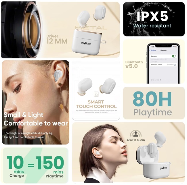 The Grooves Metal is tailored for today’s youth seeking a unique style different from the standard TWS earbuds seen among their peers. Crafted from top-grade ABS materials and adorned with a premium metallic finish in a sleek shell, these earbuds blend seamlessly into any environment. With advanced technology delivering an immersive audio experience, the Metal is ideal for those with an active lifestyle.