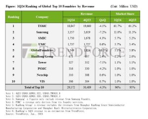 The Top 10 foundries had Q1 revenue of $29.2 billion at a QoQ drop of 4.3% in 1Q24, says TrendForce. SMIC took the No.3 after overtaking GlobalFoundries and UMC. GloFo fell to No.5. TSMC fell to $18.85 billion at an approximate QoQ drop of 4.1% but maintained its market share of 61.7%. Samsung had revenue of $3.36 billion at a QoQ drop of 7.2% in 1Q24, with a market share maintained at 11%.