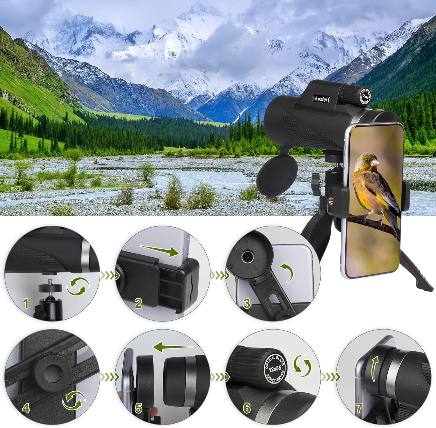 12×55 HD Monocular Telescope with Smartphone Holder, 2023 Waterproof Monocular, Lightweight Monocular for Bird Watching Hunting Camping Travel Star Watching