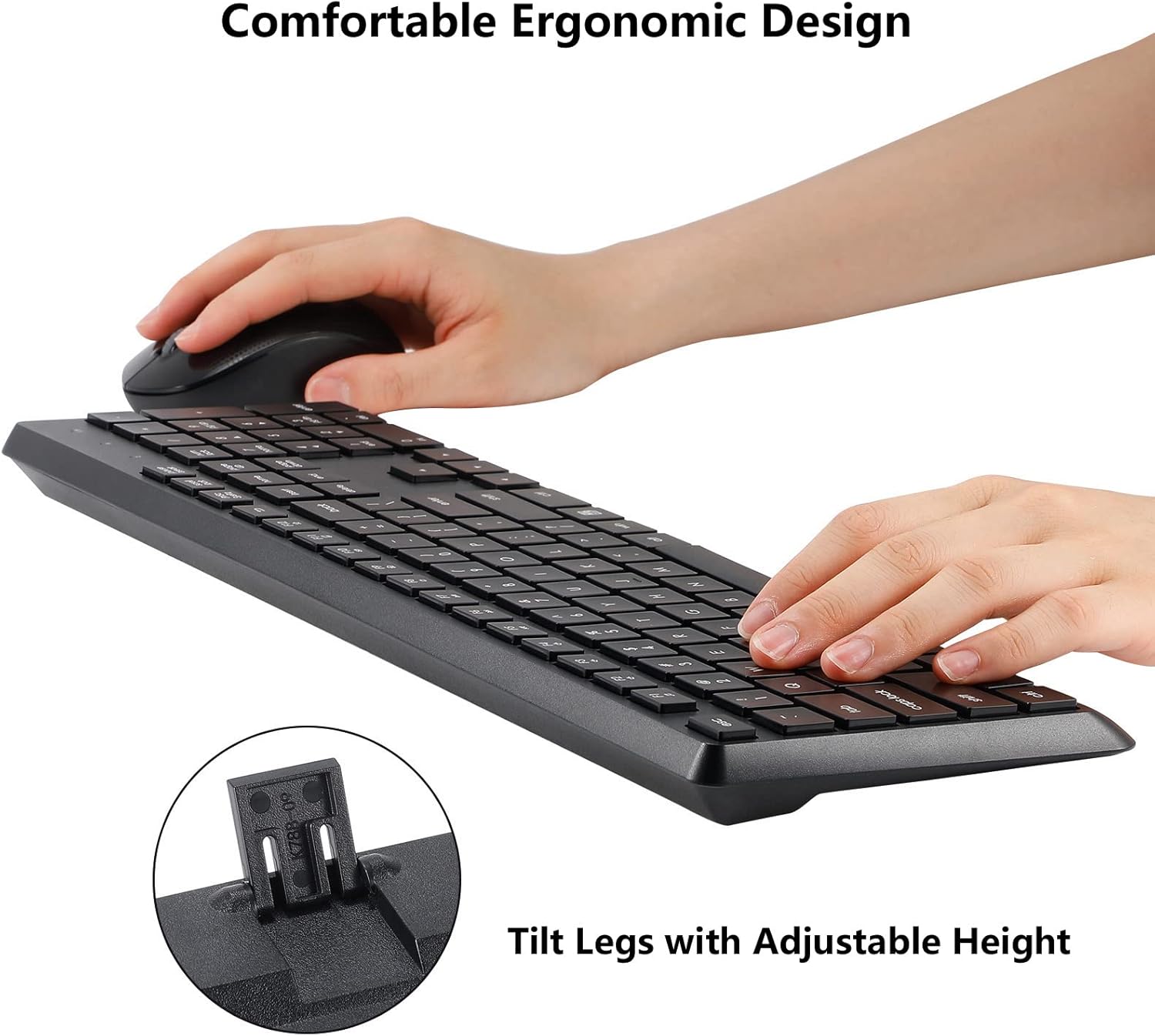 Comfortable Typing: The ergonomic full size keyboard features a spill-resistant design, durable keys and sturdy tilt legs with adjustable height, which prevent your wrists from hurting while long sessions of typing. The familiar keyboard layout, low-profile keys and number pad can provide you with a comfortable and quiet typing experience. 12 multimedia hotkeys for play/ pause, volume control, open browser/ web page, email, my computer, so you can easily improve your work efficiency.