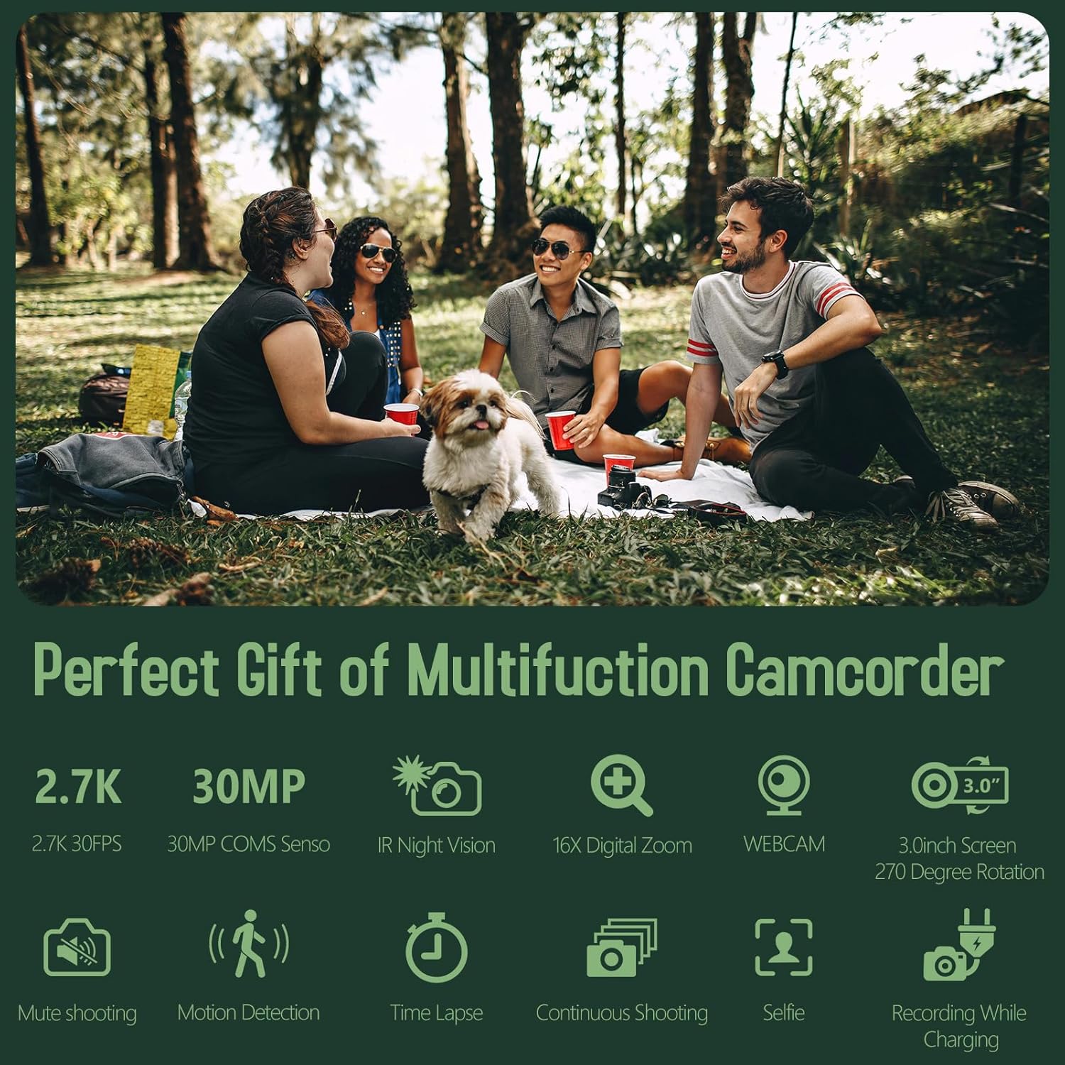 2.7K 30 FPS 30MP Camcorder Video Camera Digital Camera 16X Digital Zoom 3.0” Flip Screen YouTube Camera Vlogging Camera with 2 Batteries and Remote Control