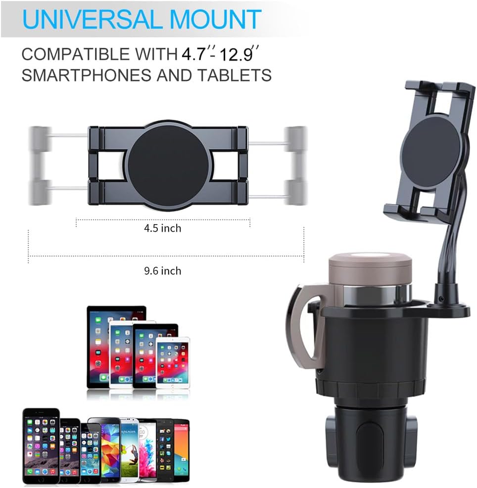 2 in 1 Cup Holder Expander Phone Mount for Car, Black, Compatible with iPhone, Samsung, iPad, Tablet, Smartphone