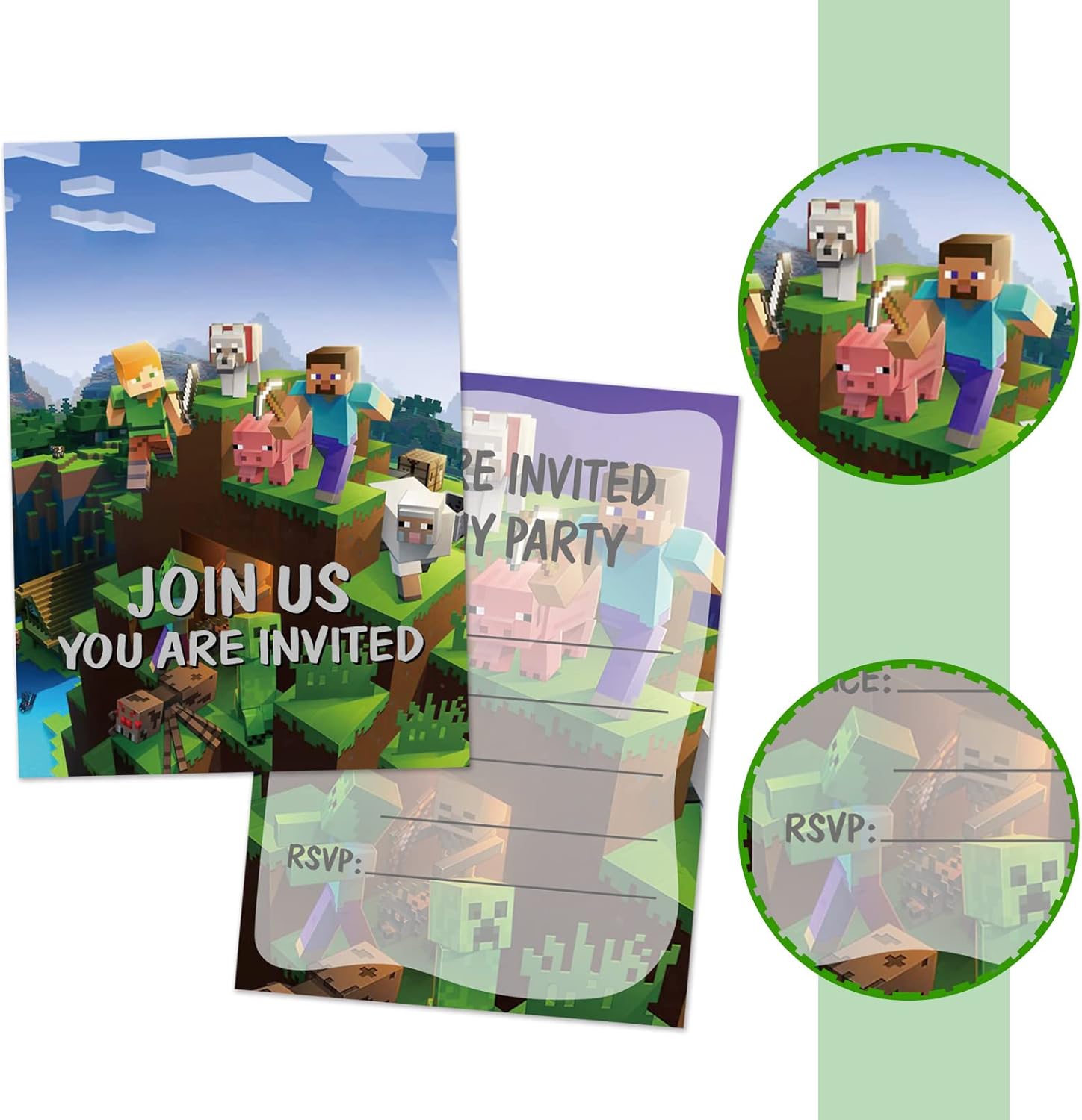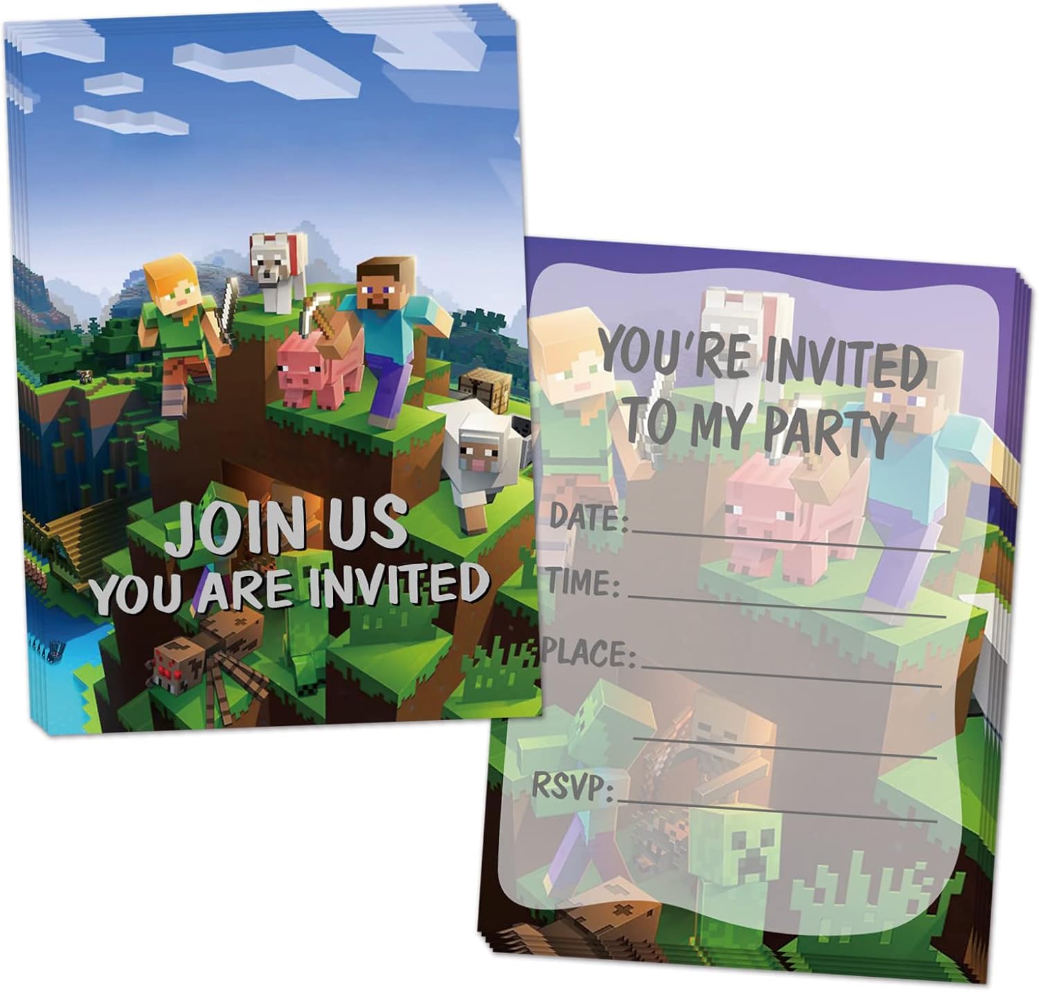 Package : Includes 24 pieces of Pixel Invitation Cards ,size of 5 x 7″. Each card is double-sided printed and has an ample fill-in space design for filling in your own personalized wording. Packed in one OPP bag( NO envelopes).