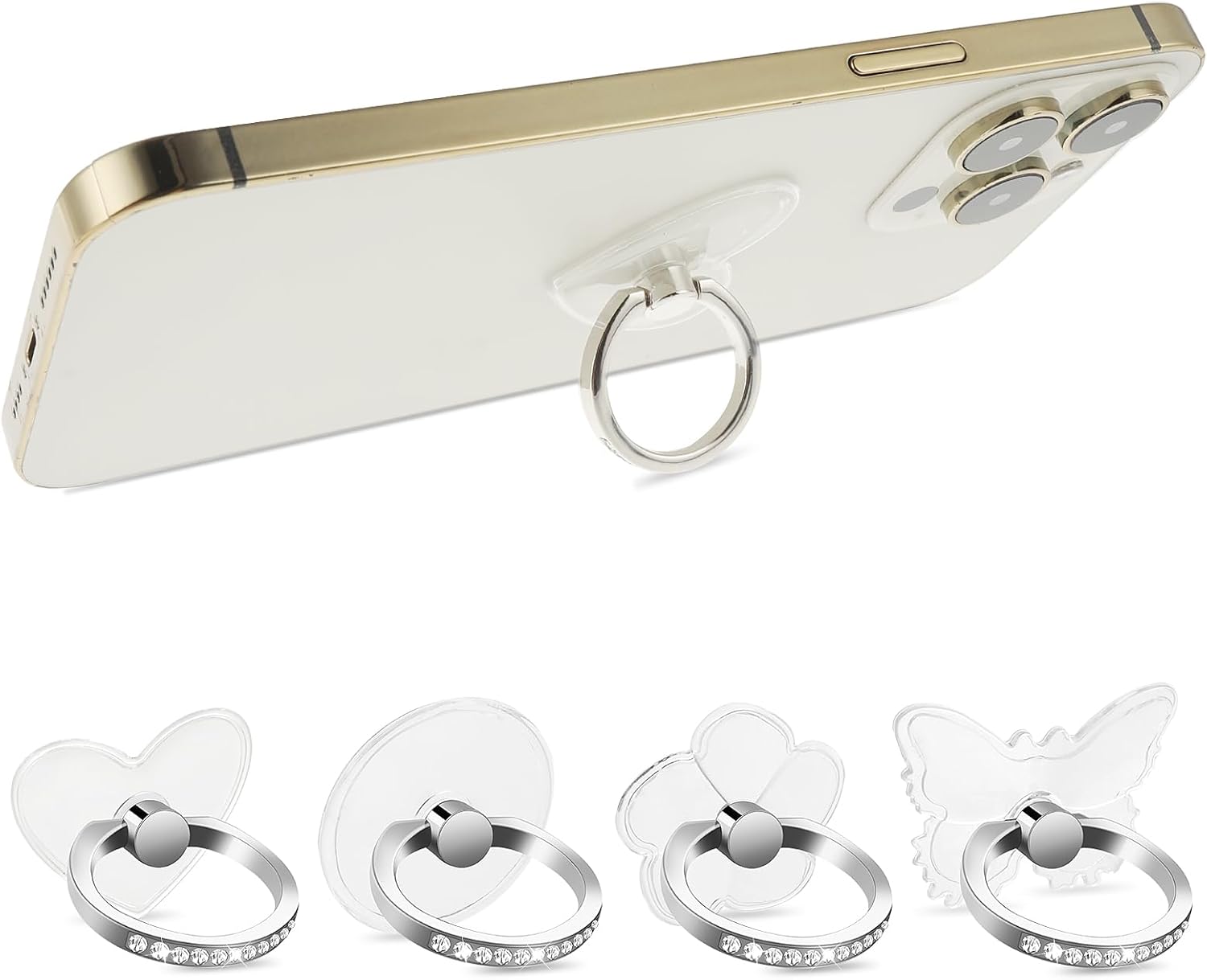 4 Pcs Rhinestone Cell Phone Ring Holder Transparent 360° Degree Rotation Universal Phone Ring Holder Finger Kickstand Clear for All Mobile Phones