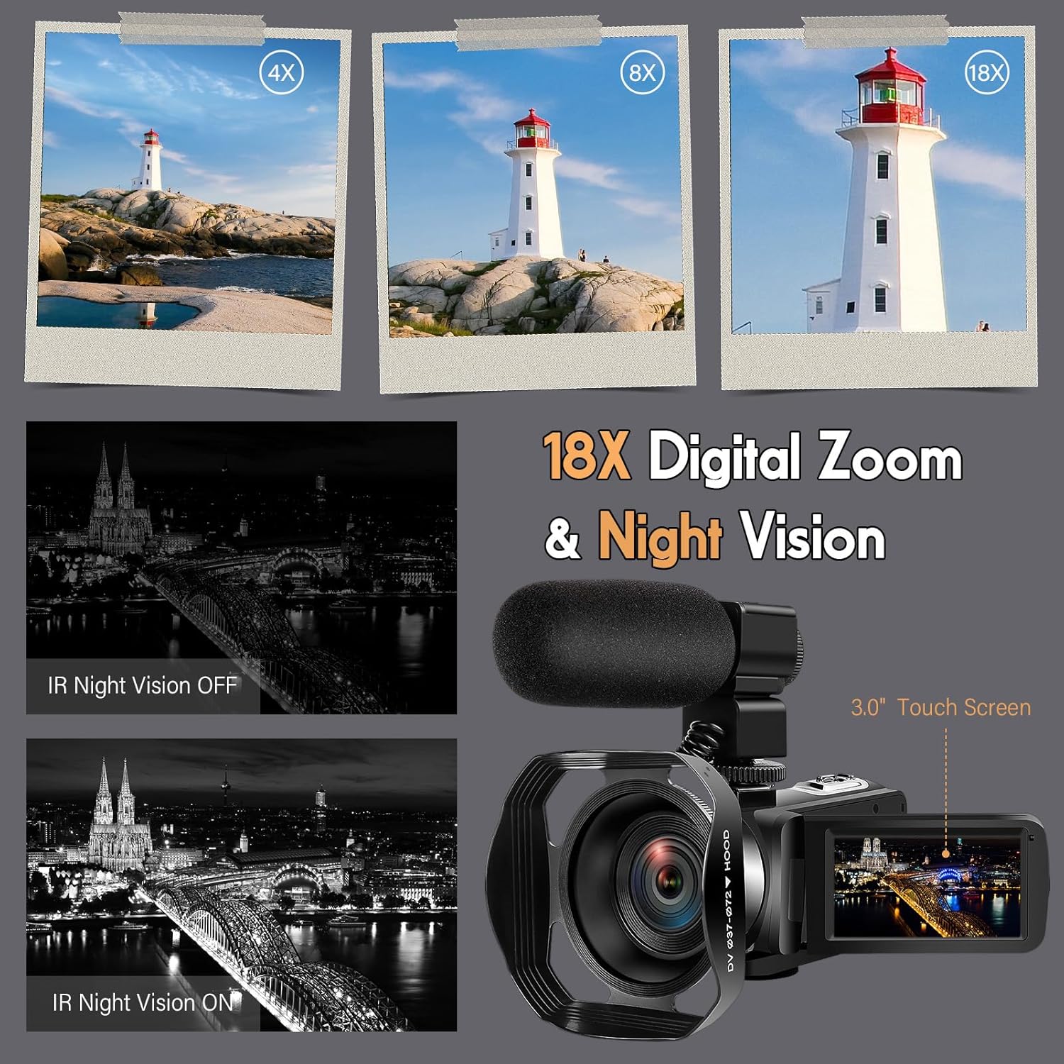5K Video Camera 64MP Camcorder IR Night Vision Vlogging Camera 18X Zoom WiFi Digital Camera for YouTube 3.0” Touch Screen Recorder Camera with 32GB SD Card, Microphone, 2.4G Remote Control