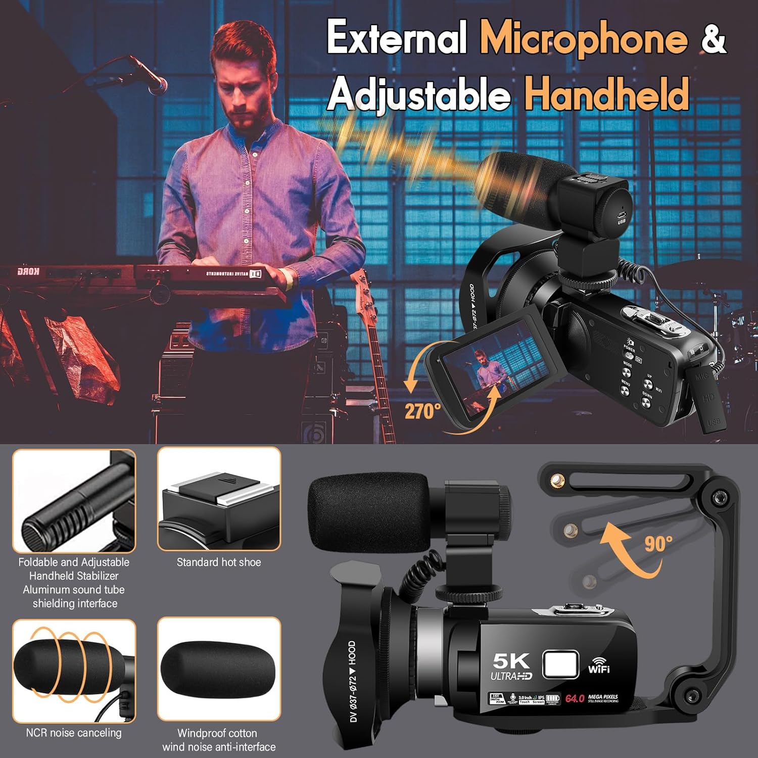5K 60FPS & 64MP Video Camera: The 5K camcorder, with advanced 5K resolution and 64-megapixel capability, excels in video and image processing. High definition allows the vlogging camera to capture high-quality images. The 5K video camera records videos in 2.7K, 4K, 4.7K, 5K HD resolution, ensuring smooth and stable video recording. The included lens hood provides better color and contrast. This camcorder is ideal for course recording, video blogs, meetings, video chats, and more.