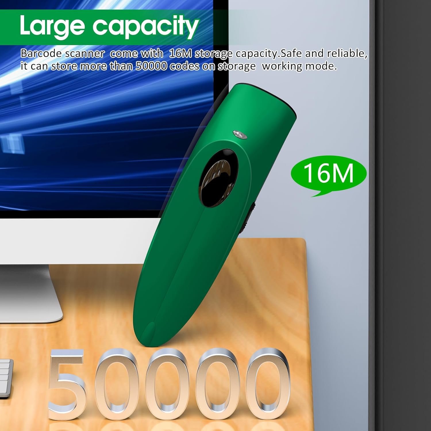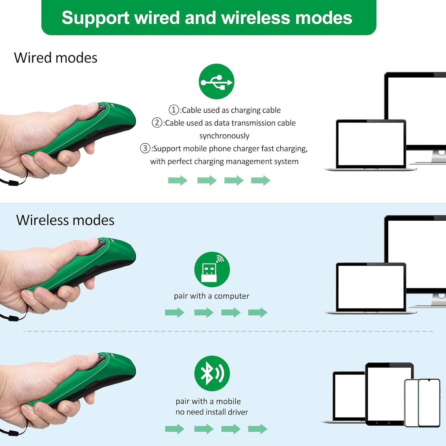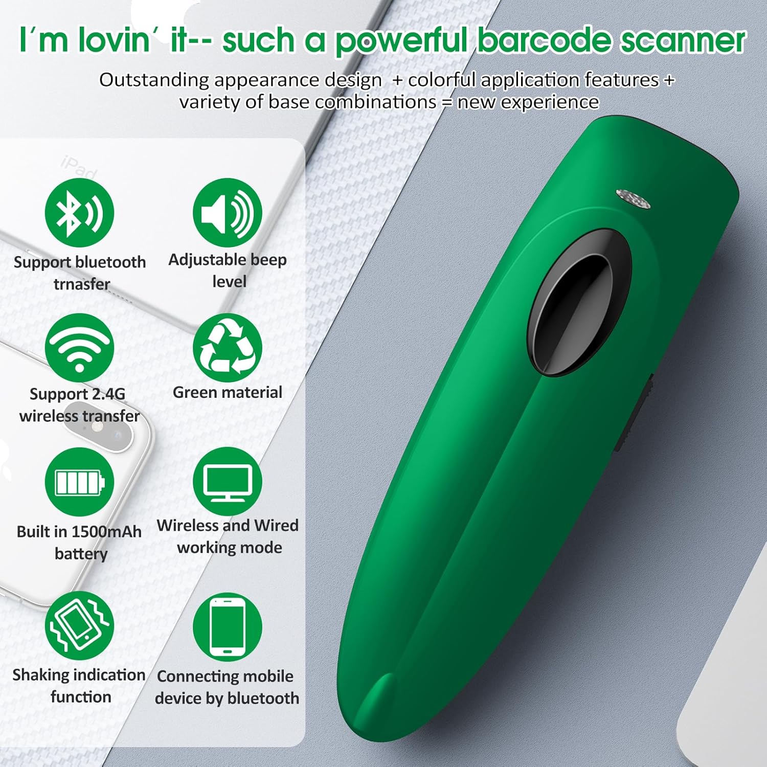 Alacrity 2D Barcode Scanner Wireless & Bluetooth & USB Wired Connection,Connect Smart Phone Tablet PC,QR Image Inventory Bar Code Scanner with Vibration Alert CO-R40 Green
