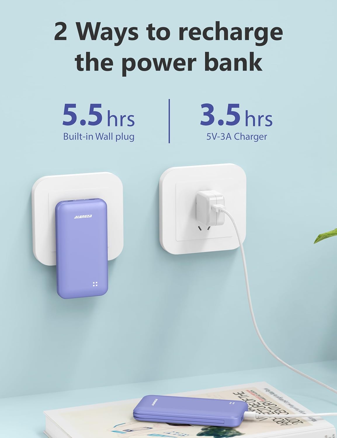 [Wall Plug and Type C Input Fast Recharge Power Bank] Two ways of fast recharging this external battery pack(5.5 hours via wall plug, 3.5 hours via Type C cable). Power bank with AC wall plug allows you to recharge the 10000mAh power bank directly from the wall outlet, and you don’t need to carry adapter and cables when you’re out. Also you can use type c cable to recharge this power bank.