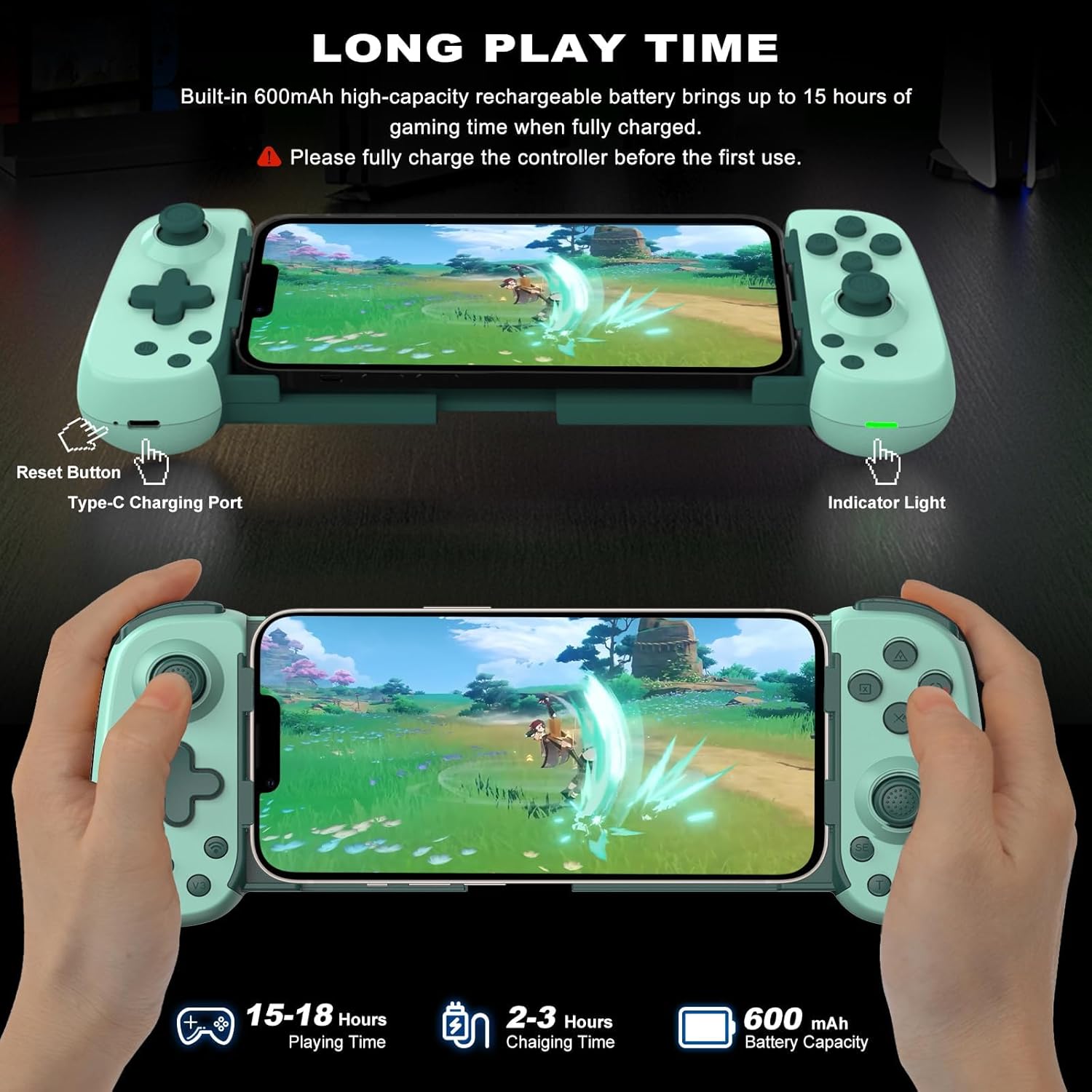 Name Mobile Gamepad Controller for iOS/Android/PC Size 22.2*10.1*4.9cm Weight 243g Product List 1x Wireless Gamepad for iPhone/Android /PC/Switch; 1x type c charging cable; 1x user manual For iOS 13.0+Systems Mobile game controller for iPhone 15/iPhone 15 Plus/iPhone 15 Pro/iPhone 15 Pro Max/iPhone 14/14 Plus/14 Pro/14 Pro Max/iPhone 13/13 mini/13 Pro/13 Pro Max/iPhone 12/12 mini/12 Pro/12 Pro Max/iPhone 11/11 Pro/11 Pro Max/iPhone X/XR/XS/XS Max/iPhone 8/8 Plus/iPhone 7/7 Plus/iPhone 6S/6S Plus.(NOT for Apple TV/iPod/Fire TV) For Android 6.0+Systems Android game controller for Samsung Galaxy S24 Ultra/S24 +/S24 /S23 Ultra/S23+/S23/S22 Ultra/S22+/S22/S21 Ultra/S21+/S21/Galaxy S20 Ultra/S20+/S20/S10e/S10+/S10/S9+/S9/Galaxy S8+/S8, Galaxy Note20 Ultra 5G/Galaxy Note10/Note10+/Galaxy Note9/Note8/Galaxy Z Fold5/Galaxy Z Flip5/Galaxy Z Flip4/Galaxy Z Flip3 5G/Galaxy Z Flip/Galaxy A54 5G/Samsung W24 Flip, for Huawei P30/P30Pro/P50 Pro/P40Pro+/Mate 40/Mate 40 Pro/P50 Pocket/Mate 40E; nova; One Plus, TCL, oppo, motorola, Vivo and more android phone. Compatible with iPad & Tablets (Controller size does not support clips for iPad and Tablet, set iPad and Tablet aside after connecting Bluetooth) for iPad controller, compatible with iPad/iPad Mini/iPad Pro/iPad Air. Tablet controller for Samsung Galaxy Tab, Lenovo Tab, Yoga Tab, Nokia T20, Smart Tab, HUAWEI MatePad etc. For Win 7-11 Systems Wireless PC controller for MacBook, PC, Notebook, Laptop (If your PC does not have its own Bluetooth function, then you need to buy another Bluetooth receiver(Bluetooth Receiver Hardware Required: Bluetooth 4.2 +) For Switch Wireless switch pro controller for Switch, Switch OLED, Switch Lite Support Streaming Support streaming on PS4/PS5/Xbox one/Xbox Series/PC Console: PS remote play/Xbox remote play/Steam Link. (Please Note: For PS remote play users, please download the V3 app on your Android phone to upgrade the firmware of the controller before using it. For iOS users, please contac us for the upgrade package) Support Cloud Gaming Support cloud gaming on iOS/Android mobile or tablet: Nvidia GeForce Now, xbox game pass, Amazon Luna, Google Stadia, Rainway, Moonlight, Arcade Function Turbo; 6-axis Gyro(for Switch/PC/PS4) ; Vibration(for Switch/PC/PS4); Play Cloud Gaming; Xbox Remote Play; PS Remote Play; Steam Link; Play Apple Arcade Games; Mfi Games; Direct Play; Low Latency Before Using the Controller (1) Please fully charge the controller before first use. (2)Ensure that the controller is turned off before Bluetooth pairing connection.