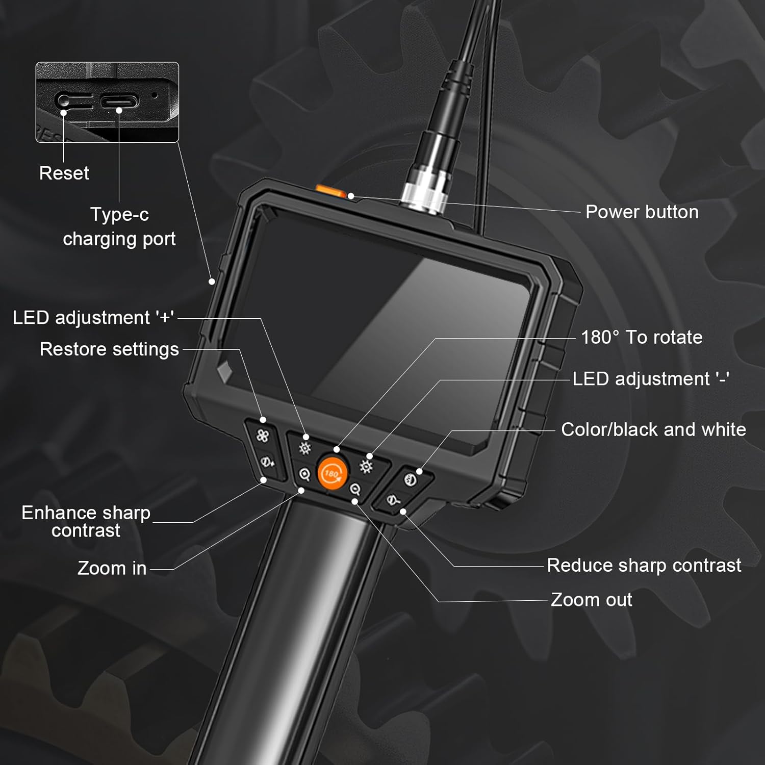 ✅【Multi-functional】 This handheld endoscope with rotating/LED light adjustment/color, black and white/reduce, enhance sharp contrast/restore settings/2x zoom function. 【Packing List】 Package includes 1x borescope inspection camera, 1x 16.5ft semi-rigid cable, 1x hook, 1x magnet, 1x mirror, 1x charging cable and 1x manual.