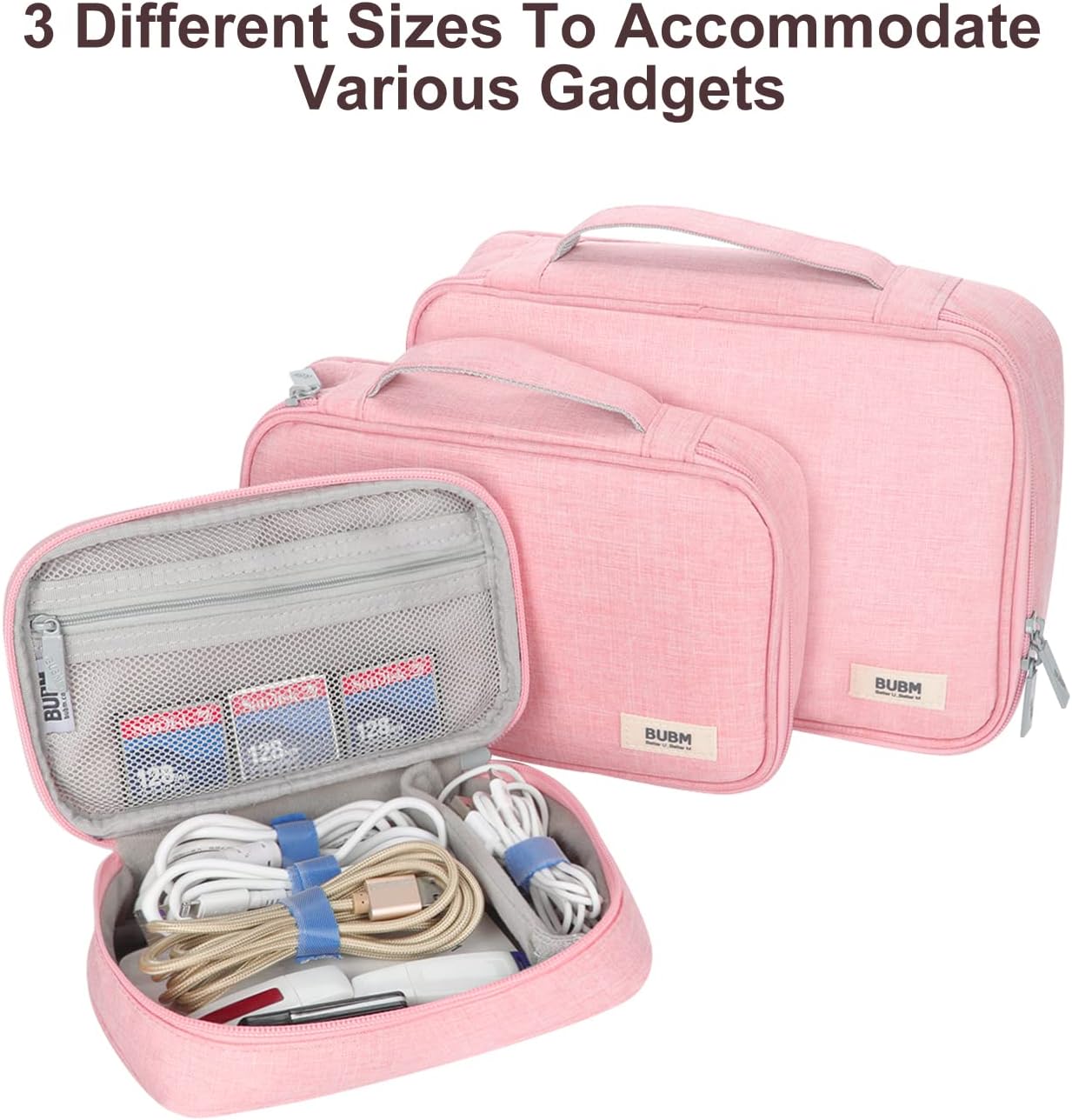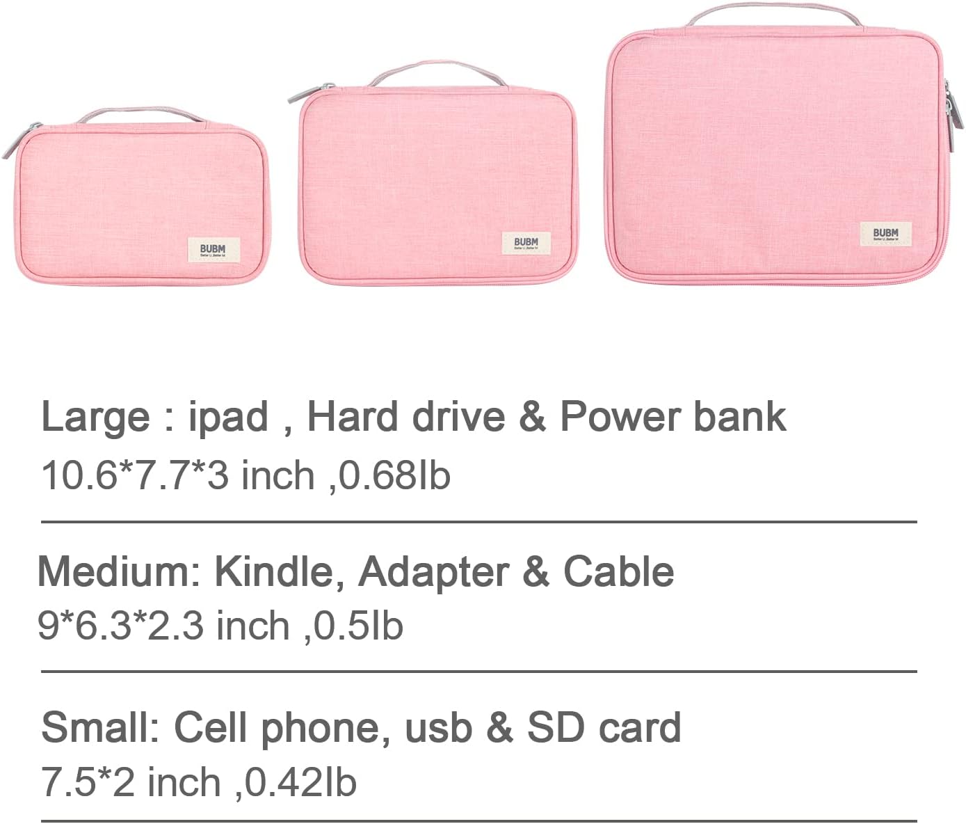 Good Organizer: This cable organizer bag comes in three sizes. The large size is 10.6 by 7.7 by 3 inches and weighs 0.68 pounds. Medium size: 9 by 6.3 by 2.3 inches, weight: 0.51 lb. The small size is 7.5 by 5 by 2 inches and weighs 0.43 pounds.
