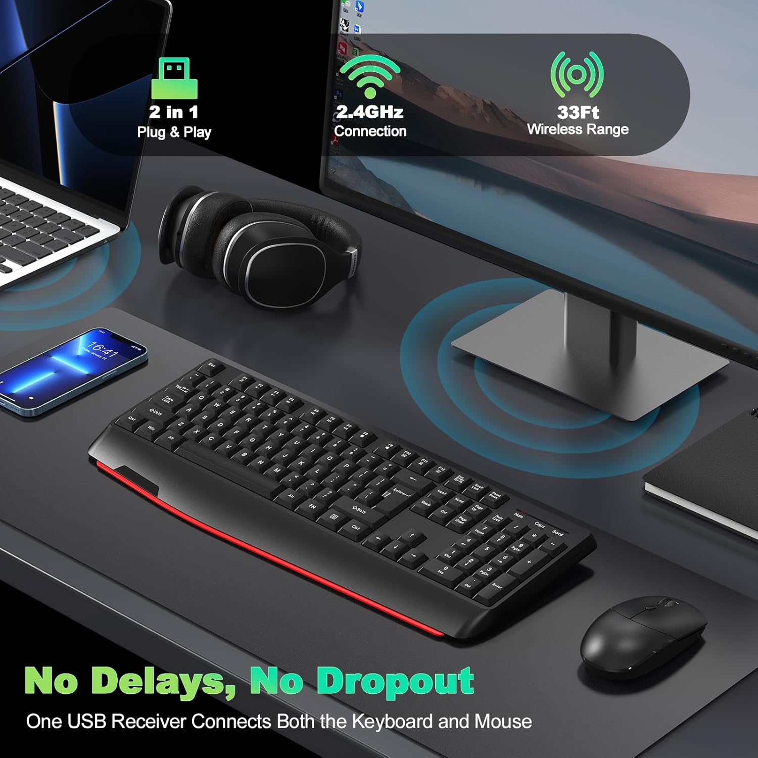 ✔️Stable 2.4G Wireless Connection: Both the wireless mouse and keyboard combo share the same USB receiver (INCLUDED in the mouse’s battery compartment), eliminating the need to occupy additional USB ports. It’s plug-and-play without any drivers. Advanced 2.4GHz wireless technology offers a powerful and reliable connection up to 33 ft with virtually no delays or dropouts, even in the busiest wireless environments.