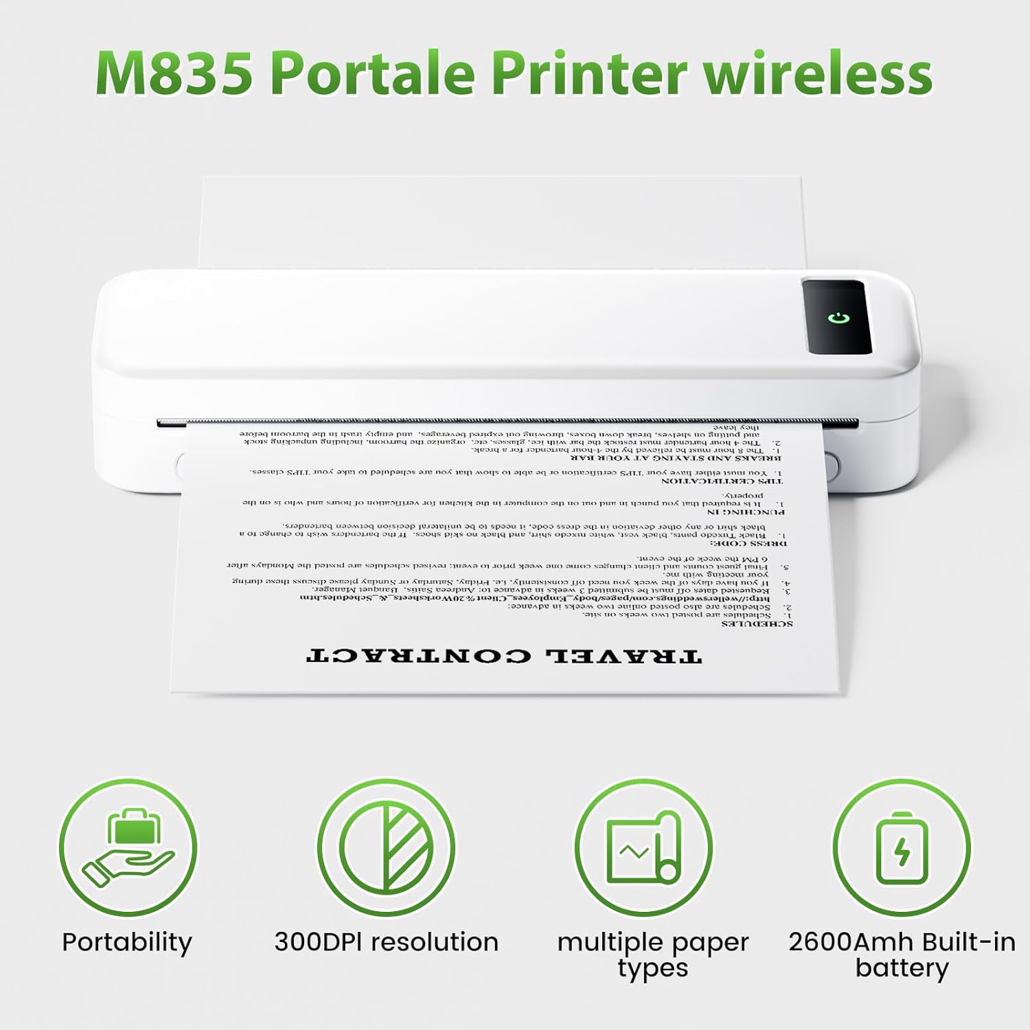 Versatile printing options: The M835 portable printer supports multiple paper sizes, including 2.08inch, 3.14inch, 4.33inch, A4 and 8.5 x 11 inch US letter. It offers three paper types: thermal roll, thermal folding, and thermal standard. Whether you’re a business professional printing reports or a student needing course materials, the M835 has you covered.
