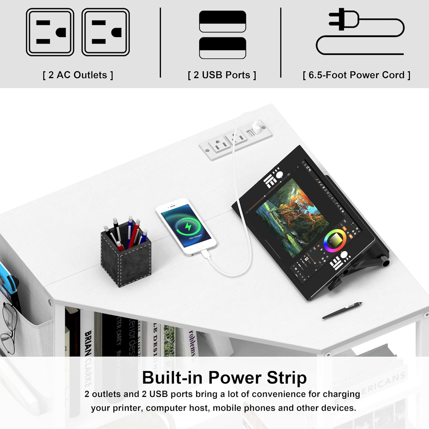 【Convenient Power Outlet and USB Ports】 This corner printer stand comes with a built-in power outlet and 2 USB ports, which provide easy access to charging your printer, laptop, computer, or smartphone without the need for additional outlets. This combination of style and function makes it an ideal choice for those who value convenience while working.