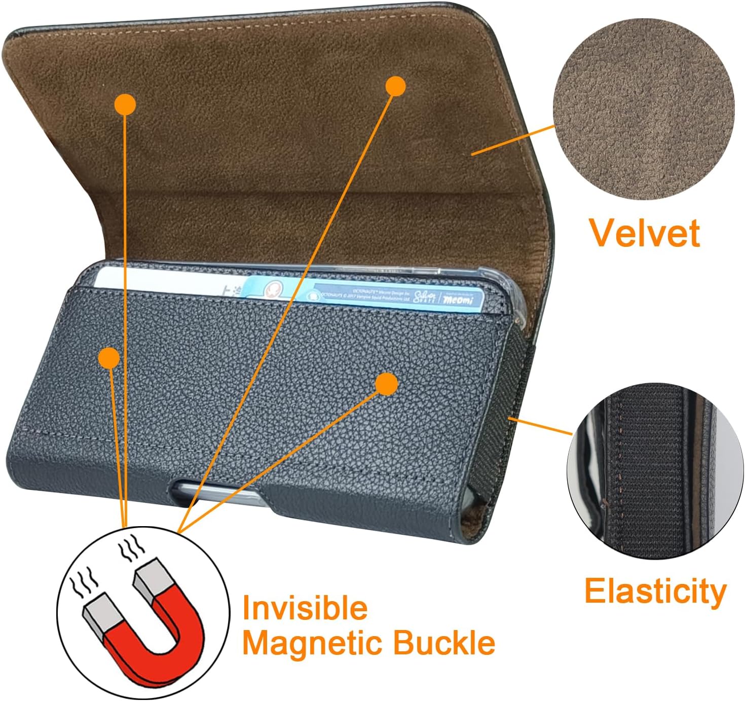 2.Elastic sides provide an excellent fit. The fit of the holster pouch is perfect if you have a case around your phone.