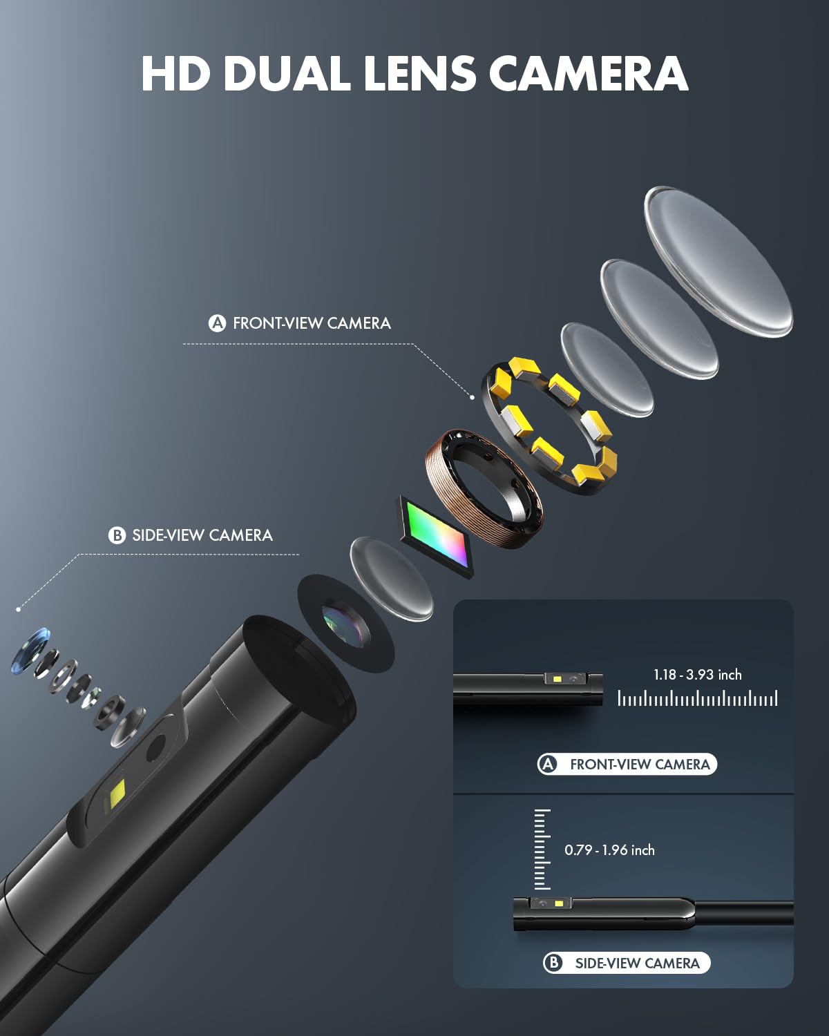 ✅[Dual Lens Scope Camera] The inspection camera has dual-lens technology that allows you to switch between different viewing angles without installing a side mirror; and this endoscope camera with light provides HD photos & a smooth video experience, which will all be stored on your phone, eliminating the need to transfer media via USB to share with others.