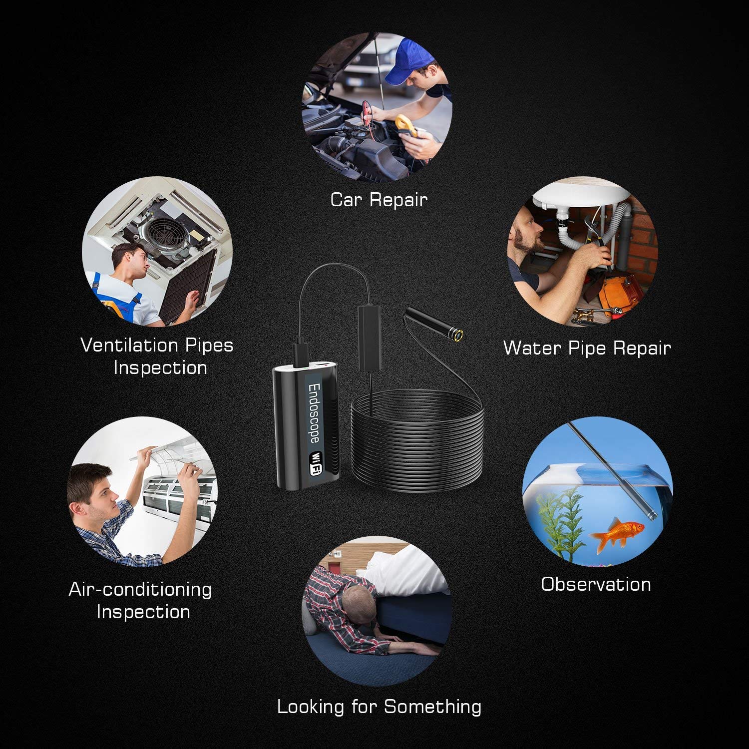 ★★Long Working Time ★★ :The endoscope wifi is powered by 800mAh rechargeable lithium battery. This working time of wireless borescope up to 2 hours when it gets fully charged.