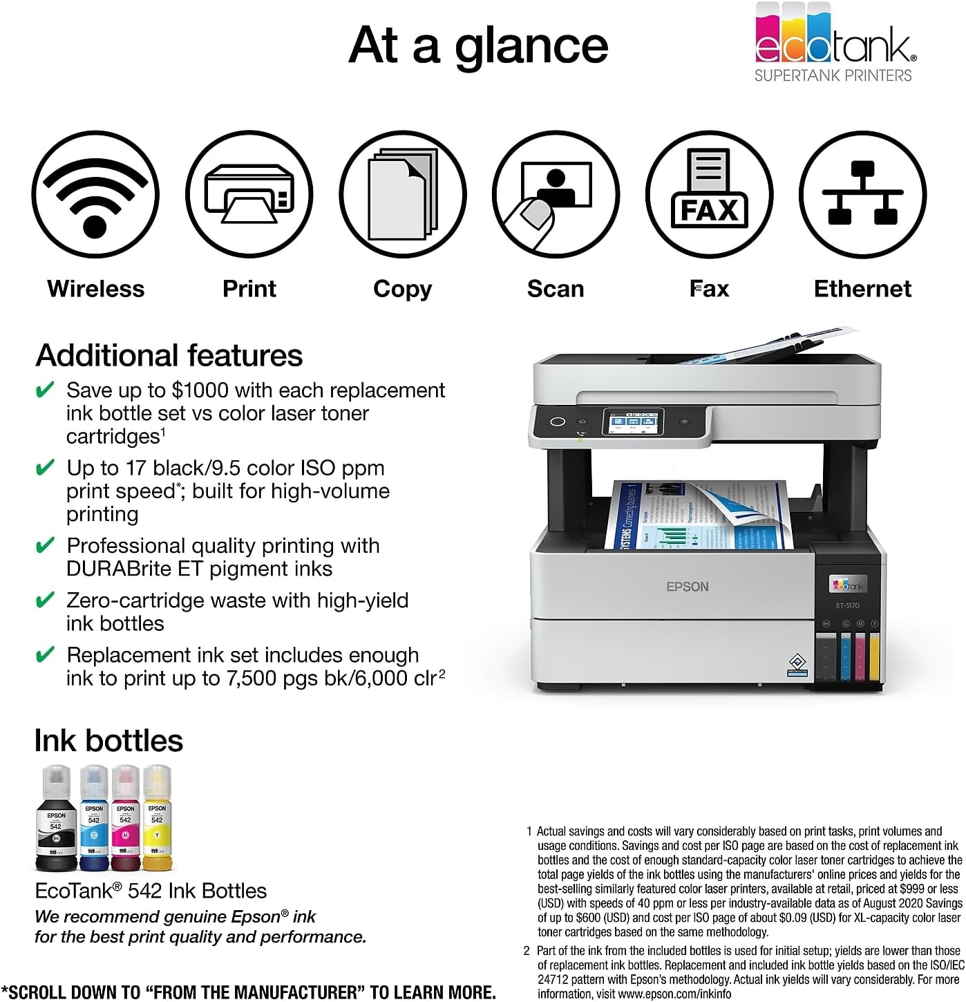 *Promo valid for ET-5150, ET-5170, ET-5180 ET-5800, ET-5850, ET-5880, ET-16600 or ET-16650 printers purchased from 10/1/2021 to 3/31/2025. Product must be registered within 30 days of purchase. Limit four 542 ink bottles per claim. Each claim cannot contain multiple bottles of the same color. Retain your empty 542 ink bottle for submission along with rebate form. Promotion applies to ink only. Printer covered by Epson 2-year ltd warranty with registration. For promo participation, you must register your product. See manufacturer’s website for details. Ideal for high-volume environments, the EcoTank Pro ET-5170 all-in-one supertank printer offers fast Cartridge-Free Printing, plus copy, scan and fax. Save up to 80 percent with low-cost replacement ink bottles vs. standard-capacity color laser toner cartridges (1) – that’s about 2 cents per color ISO page versus 14 cents with cartridges (1). Engineered for high productivity in a small footprint, the ET-5170 delivers professional-quality prints face down for greater privacy. This hardworking printer offers demanding businesses reliability they can count on, including a 2-year limited warranty with registration (2) and permanent printhead designed to last the life of the printer. Plus, there’s zero cartridge waste. Ƚ Black and color print speeds are measured in accordance with ISO/IEC 24734. Actual print times will vary based on factors including system configuration, software, and page complexity. 1. Actual savings and costs will vary considerably based on print tasks, print volumes and usage conditions. Savings and cost per ISO page are based on the cost of replacement ink bottles and the cost of enough standard-capacity color laser toner cartridges to achieve the total page yields of the ink bottles using the manufacturers’ online prices and yields for the best-selling similarly featured color laser printers, available at retail, priced at $999 or less (USD) with speeds of 40 ppm or less per industry-available data as of August 2020. Savings of up to $600 (USD) and cost per ISO page of about $0.09 (USD) for XL-capacity color laser toner cartridges based on the same methodology. 2. 12 months of standard limited warranty or 80,000 plain paper sheets (whichever happens first). For an additional 12-month extended service plan (total of 24 months or 80,000 plain paper sheets, whichever happens first), register your product and use Epson genuine ink bottles. See Limited Warranty for details. 3. Part of the ink from the included bottles is used for initial setup; yields are lower than those of replacement ink bottles. Replacement and included ink bottle yields based on the ISO/IEC 24712 pattern with Epson’s methodology. Actual ink yields will vary considerably for reasons including images printed, print settings, temperature and humidity. Yields may be lower when printing infrequently or predominantly with one ink color. All ink colors are used for printing and printer maintenance, and all colors must be available for printing. 4. Requires Smart Panel app download. Data usage fees may apply. 5. Wi-Fi CERTIFIED; level of performance subject to the range of the router being used. Wi-Fi Direct may require printer software. 6. Epson Connect account and voice-activated account registration required. 7. SmartWay is an innovative partnership of the U.S. Environmental Protection Agency that reduces greenhouse gases and other air pollutants and improves fuel efficiency.