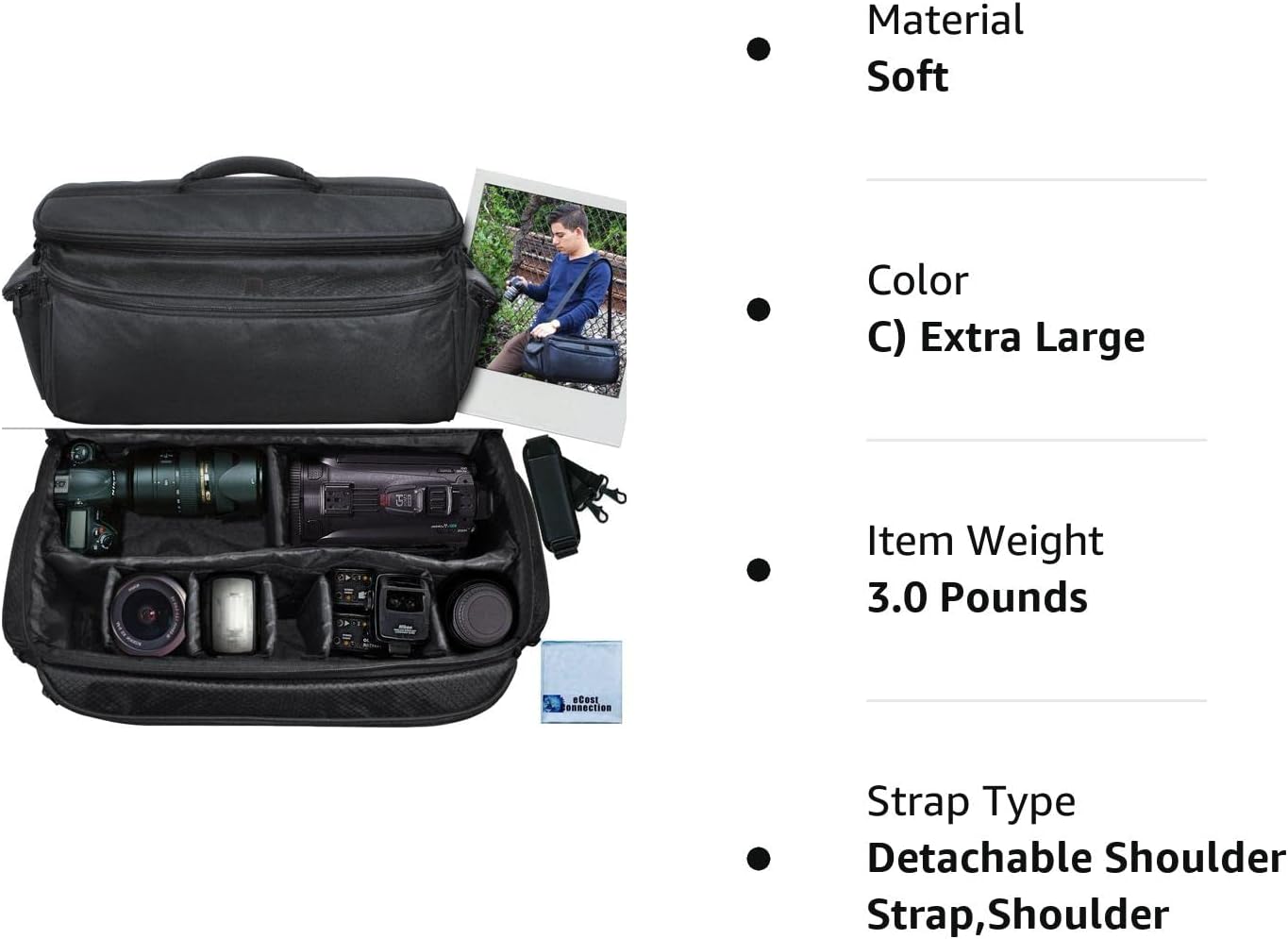This Deluxe Camera/Video Padded Carrying Case is a extra large size bag that is perfect for transporting your DSLR cameras, camcorders, lenses, flashes, etc.