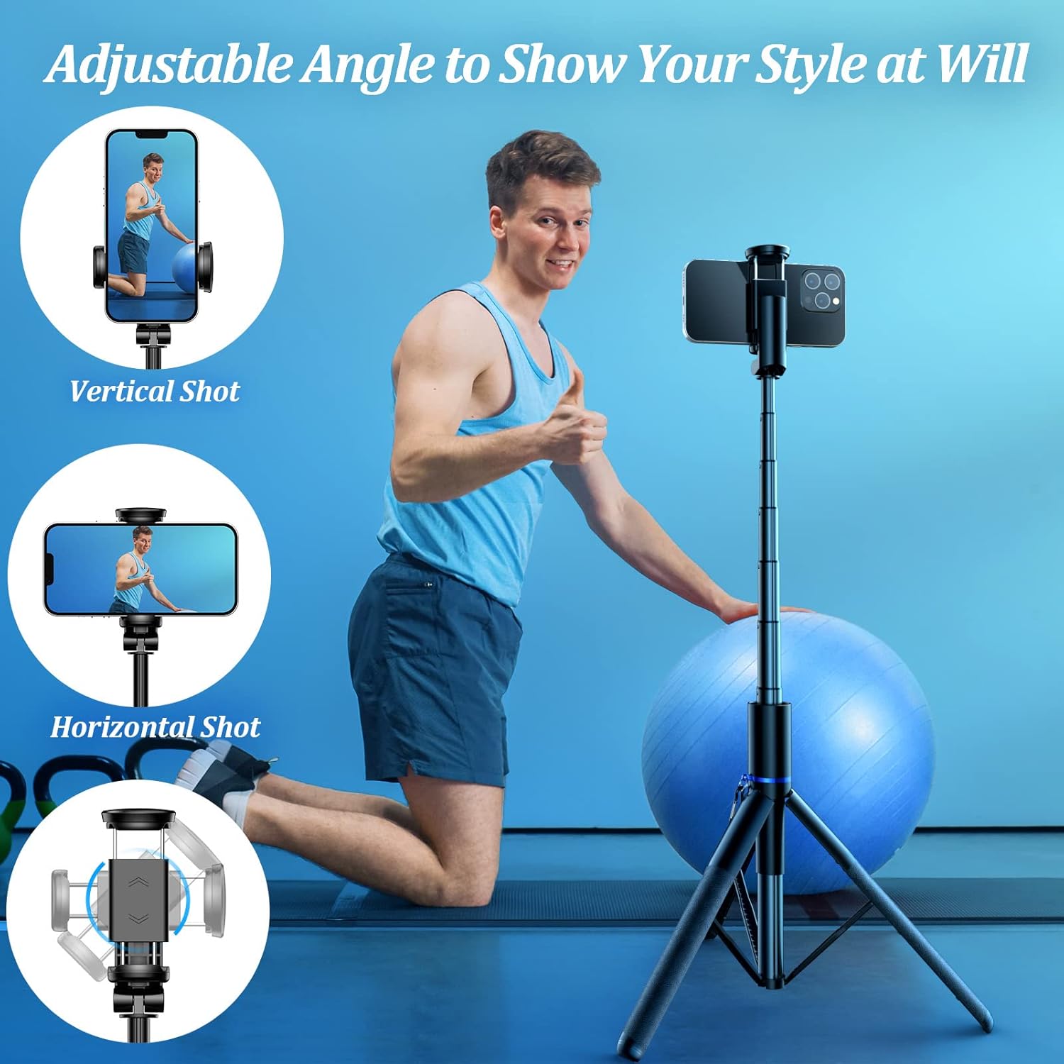 【61” Adjustable Telescopic Pole】Made of Aluminum Alloy, corrosion-resistant, sturdy and durable, not easy to shake; The height of the cell phone tripod can adjust from 11.4 to 61 inches via 7-stage, offers you to capture a broader field of view, and satisfies your needs in different occasions.