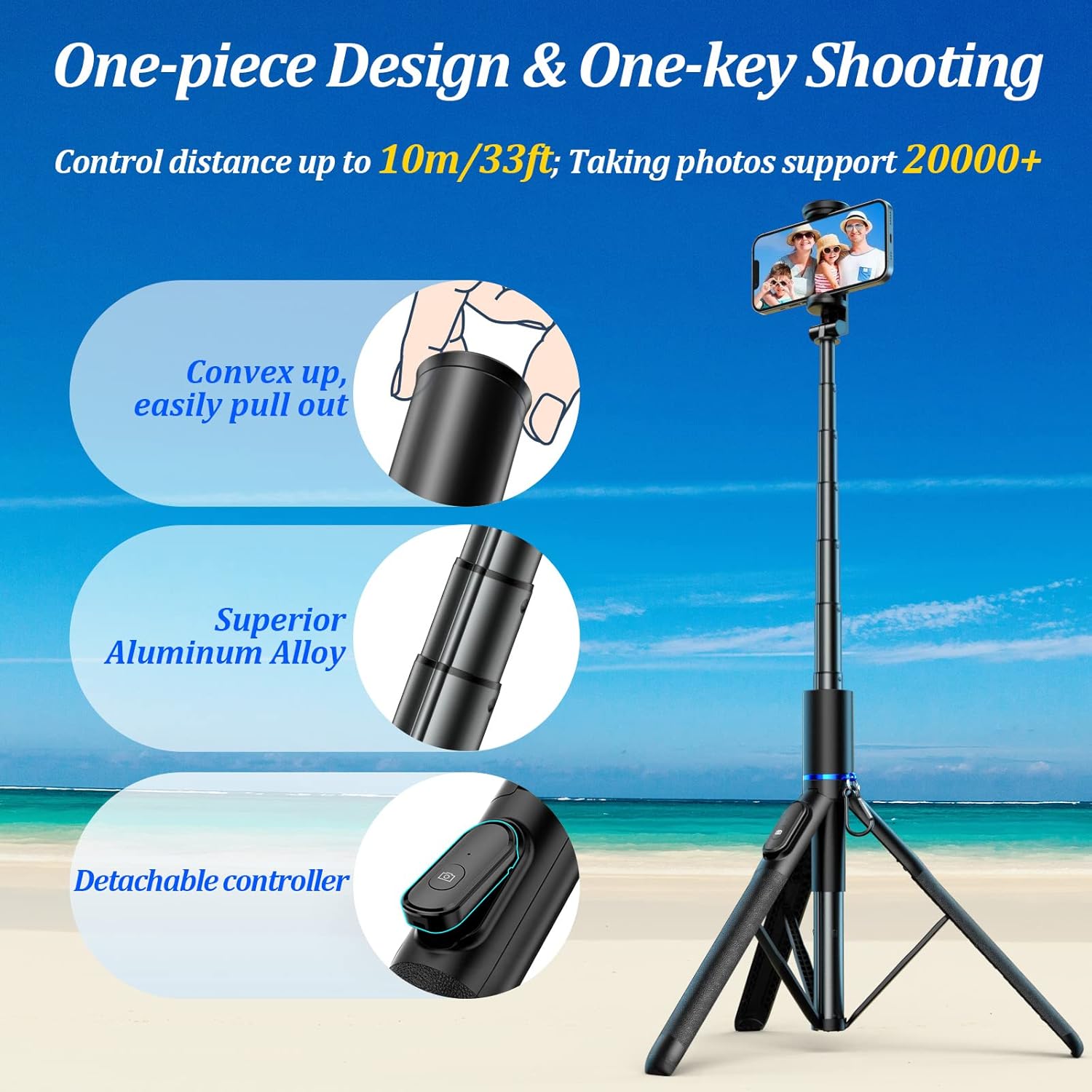 【Detachable Wireless Remote Shutter】With a separate remote control, mobile phone compatibility is as high as 98%. Wireless connection is convenient and fast to One-key Shoot, max support 10m. When not in use, just place it onto the tripod to avoid being lost.