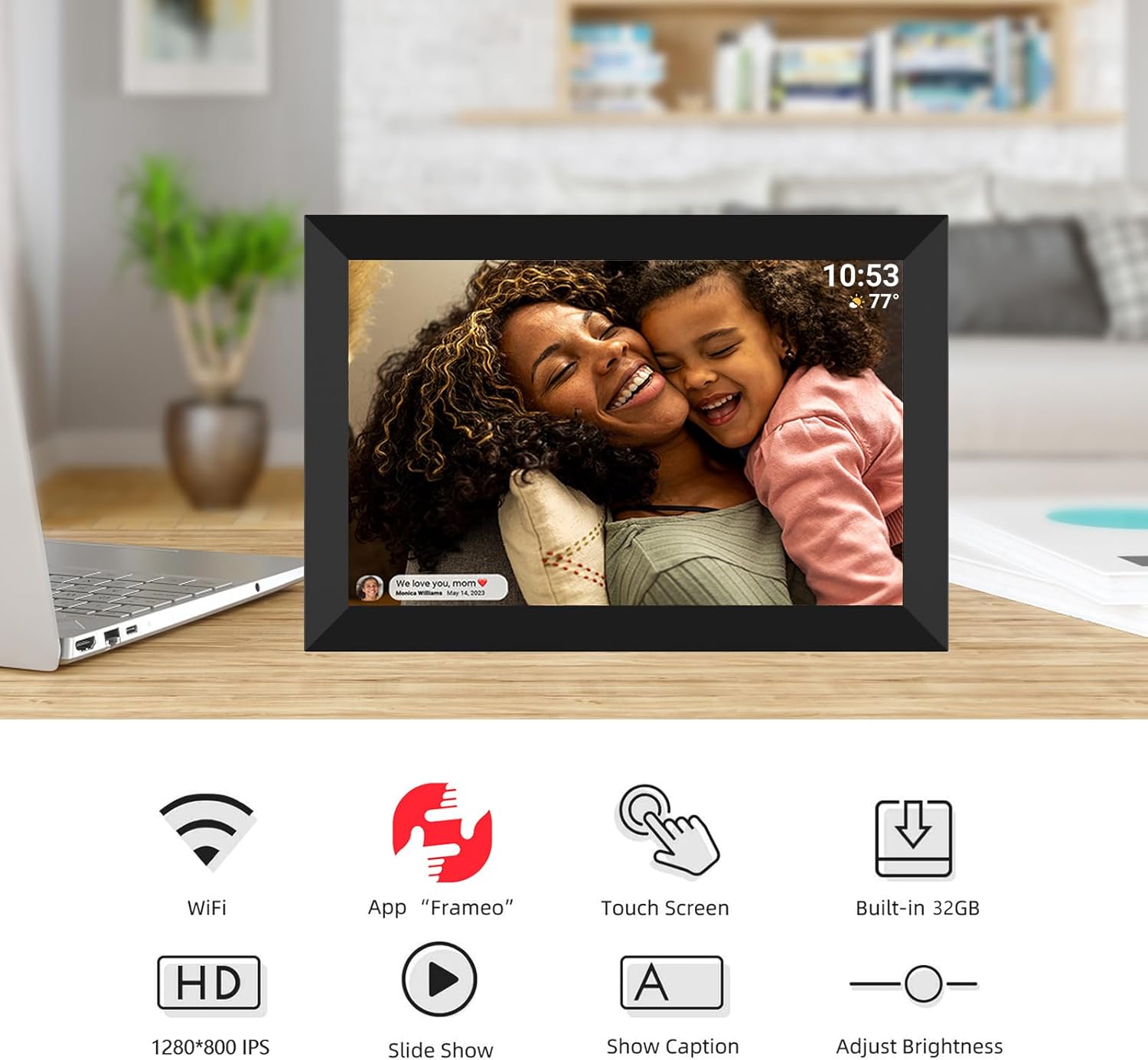 🎁 【Stunning Image Clarity】The 10.1 inches Frameo WiFi digital photo frame with HD IPS touchscreen, with a 16:10 ratio and 1280×800 resolution, delivers crystal-clear picture and video quality. Enjoy a remarkable viewing experience from any angle, with a wide 178° viewing angle.