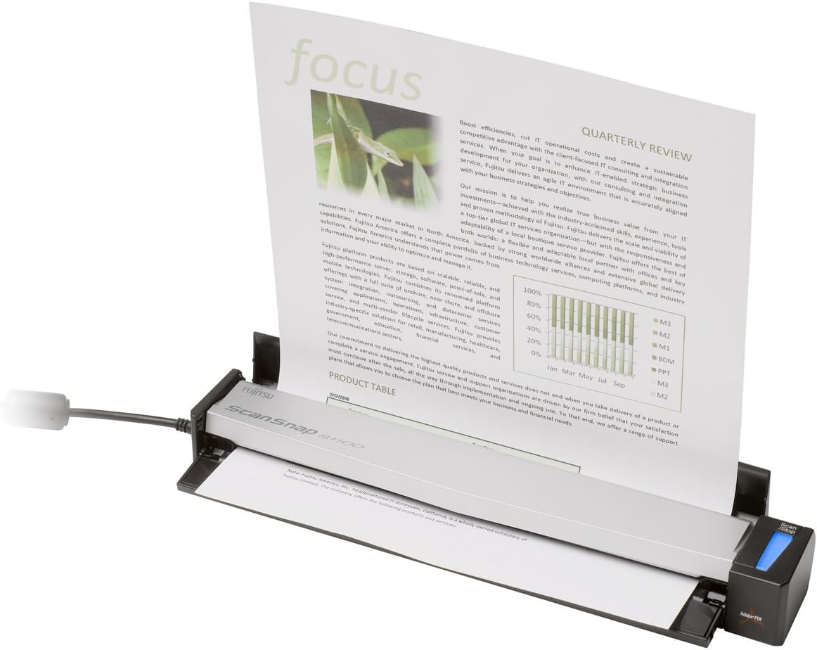 This featherweight champion packs quite a punch. The ScanSnap S1100 is our most mobile ScanSnap ever. It’s weight (12.3 ounces) makes it feel almost non-existent in a carry-on, and it’s dimensions let it fit practically anywhere. Scan all the paperwork you encounter from full-size documents to business cards and receipts and quickly get them out of the way and off your mind.What’s in the box: Fujitsu ScanSnap S1100 Color Mobile Scanner, USB Cable, Getting Started Guide, Set-Up and Software DVD-ROM and 1 Year Limited Warranty.What’s in the box: Fujitsu ScanSnap S1100 Color Mobile Scanner, USB Cable, Getting Started Guide, Set-Up and Software DVD-ROM and 1 Year Limited Warranty.