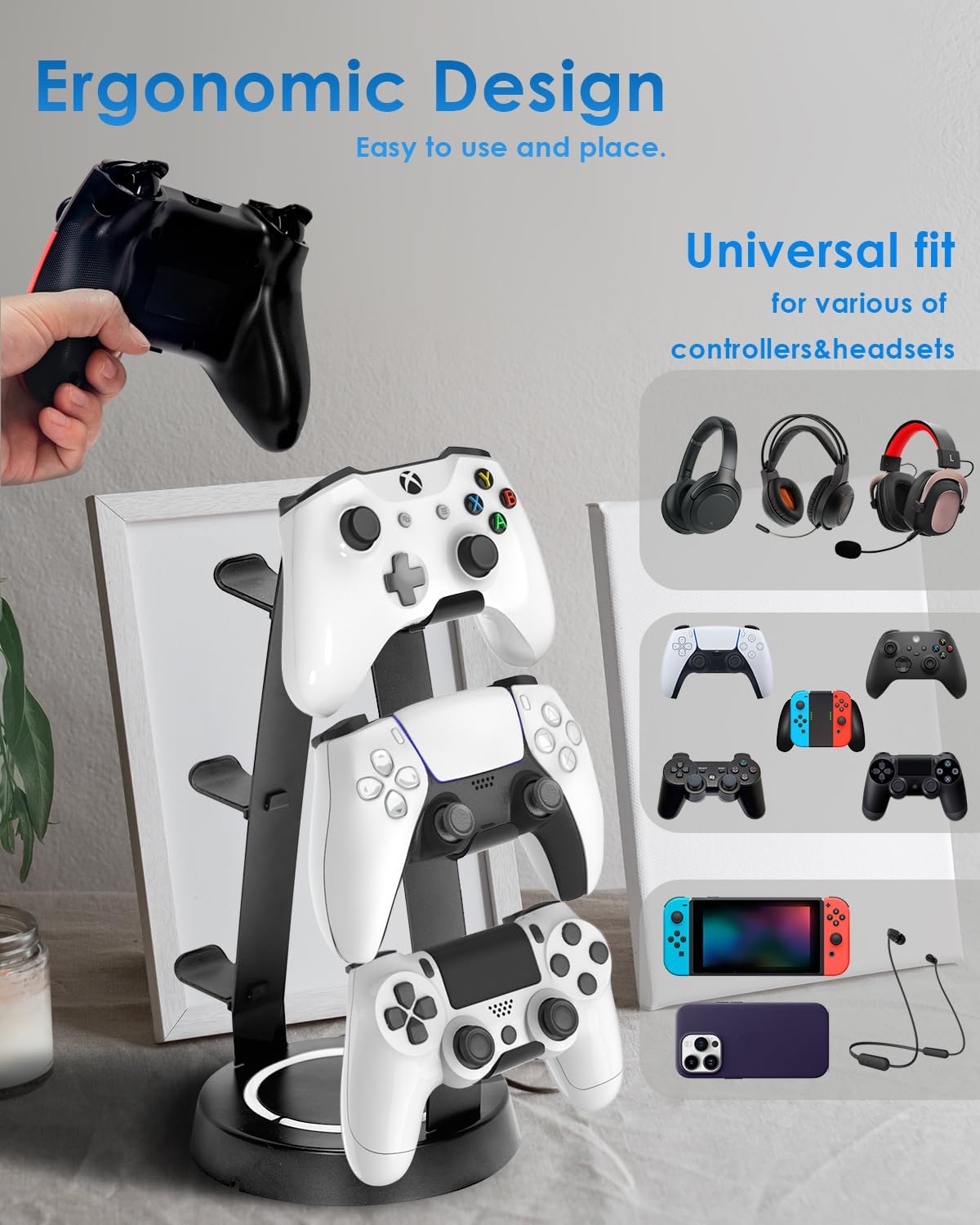【Within Reach&Clutter-free】The controller holder can hold up to 6 controllers, or 3 controllers and 1 full-size gaming headset, siutable for most controllers and headsets of all size and brand. The A-Shaped makes it easier to place the controllers Without collision.