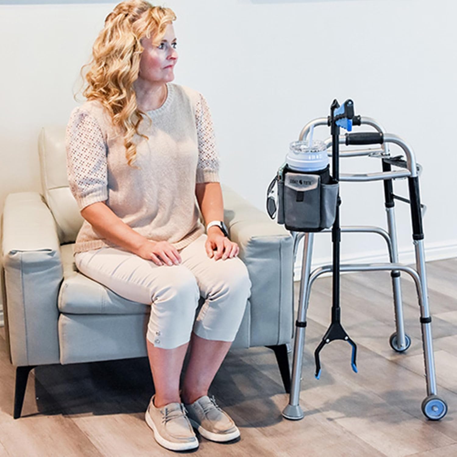 Easily carry everything you need to enjoy your day out with the Goat Tote. The Goat Tote attaches, either vertically or horizontally, to walkers, rollators, wheelchairs, scooters, golf carts and more. The middle compartment is designed for large, insulated tumblers but if you want to carry a can of soda or to-go coffee, that’s not a problem: Just slip something inside the interior drawstring bag (such as ice) and the height of the compartment will be reduced to the perfect size for smaller containers. Bottom of Goat Tote is waterproof so anything that spills or melts will not leak through. Beverage compartment is flanked by two handy pockets for your phone, sunglasses, keys, etc. The large front pocket is secured by a hook-and-loop fastener: Use it to safeguard cash, credit cards, et al. Lastly, two clips are included so you can fasten your cane or reaching aid to your mobility device plus there’s a carrier hook to loop over purse, shopping bag, etc. – providing you with additional carrying capacity. – This carry bag for mobility devices may be the greatest of all time: Stay hydrated and prepared for everyday contingencies with the Goat Tote Mobility Combo Pouch. Hook-and-loop straps allow you to fasten, either horizontally or vertically, the Goat Tote to your walker, rollator, wheelchair, scooter, etc. . Rubberlike grip strap is included to provide the necessary friction when you’re attaching Goat Tote to device that does not have a horizontal crossbar to prevent Goat Tote from sliding out of reach. Designed for large beverages, Goat Tote can be adjusted so smaller drinks can be carried with ease. In addition to versatile cup holder, there are three nifty pockets to carry other essentials such as glasses and phones; front pocket has a closeable flap for privacy. Bottom of beverage compartment has an interior drawstring bag to tuck things away further out of sight. A carrier hook is included in case you need somewhere to loop a purse, shopping bag, umbrella, etc.