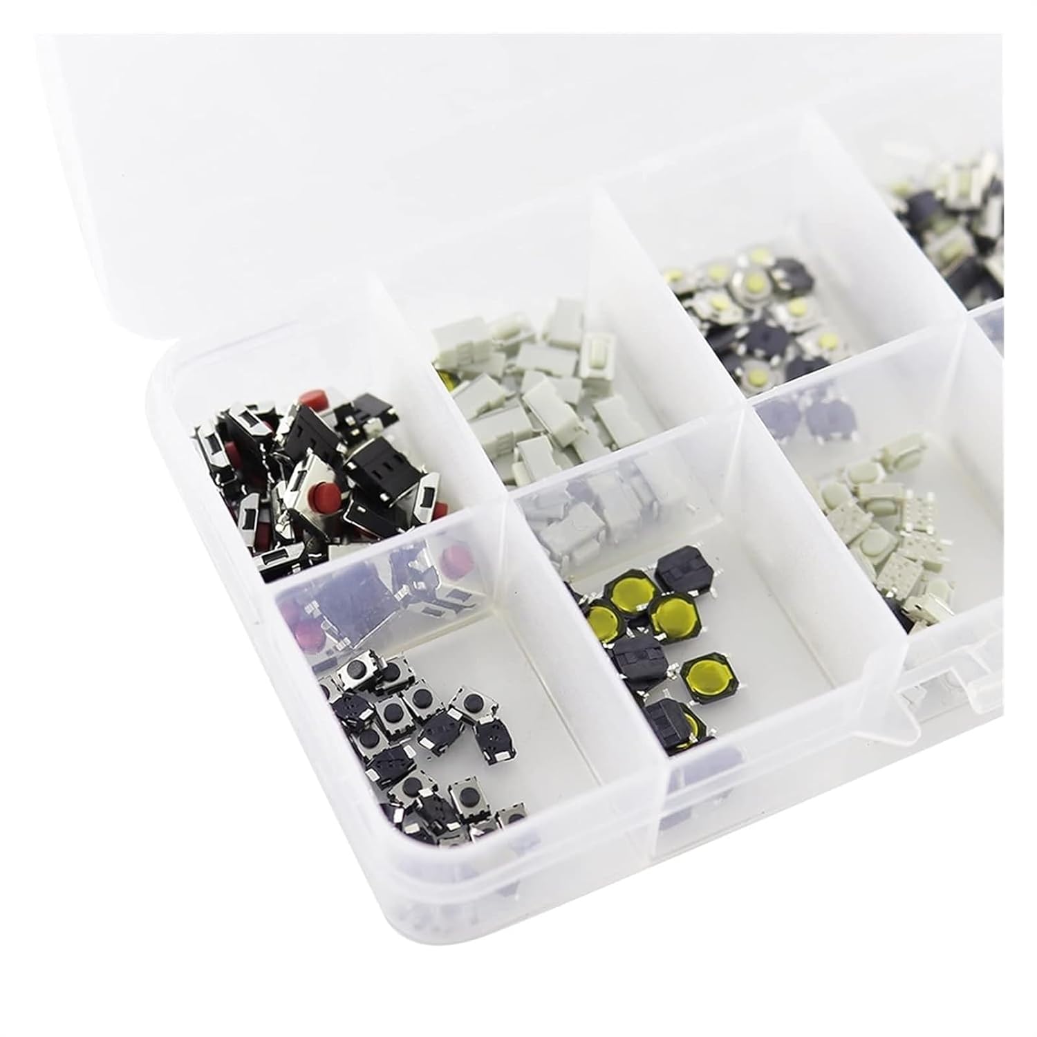 Includes 250 pieces of button switches in various sizes with a storage box