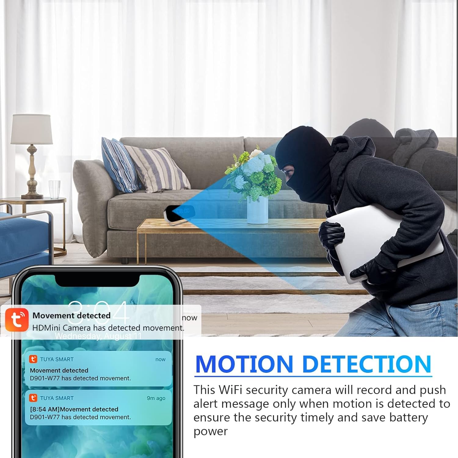 【Smart Hidden Camera】This mini spy camera comes with APP remotly real-time video without soun, 1080P HD lens, night vision light, motion detection sensor, it can help you monitor your home and office safety efficiently.