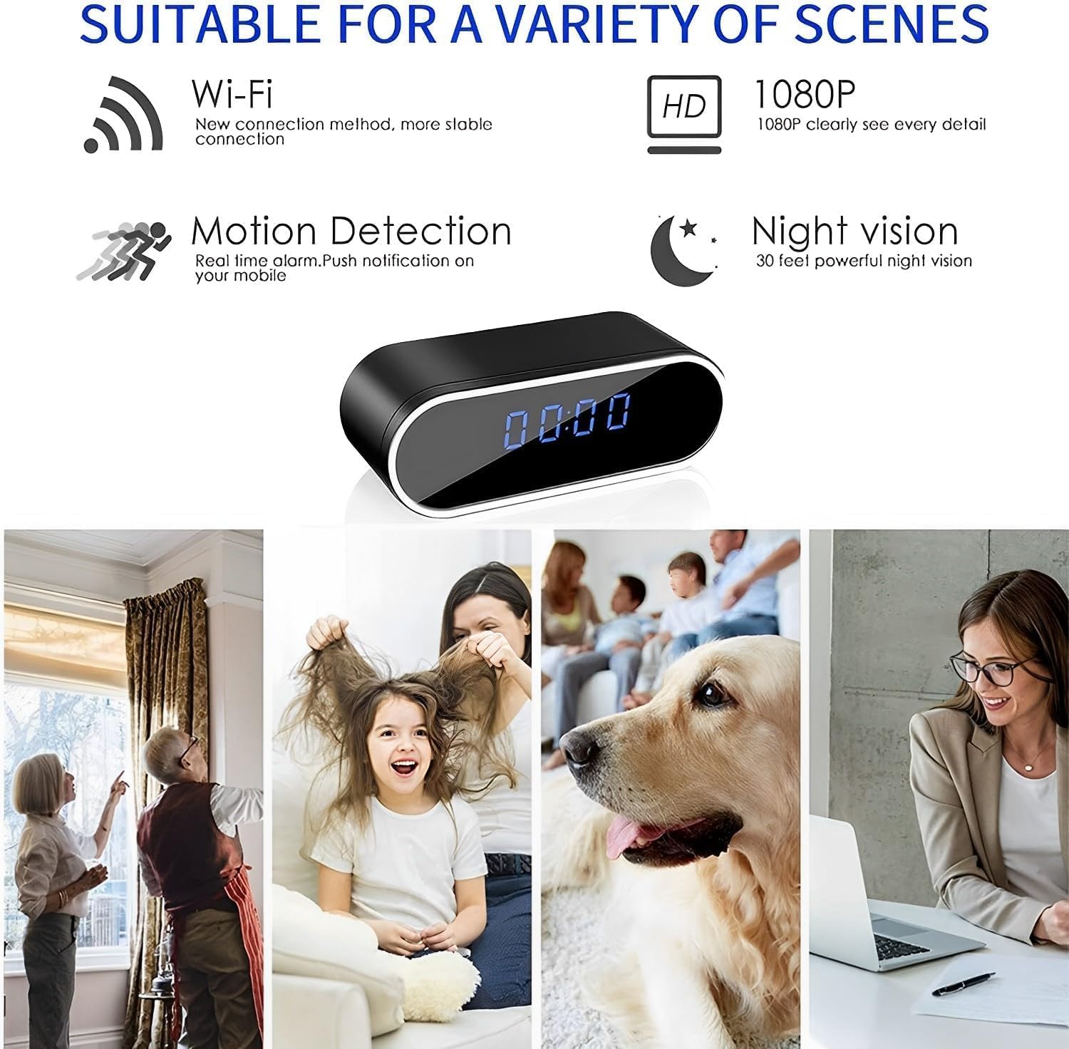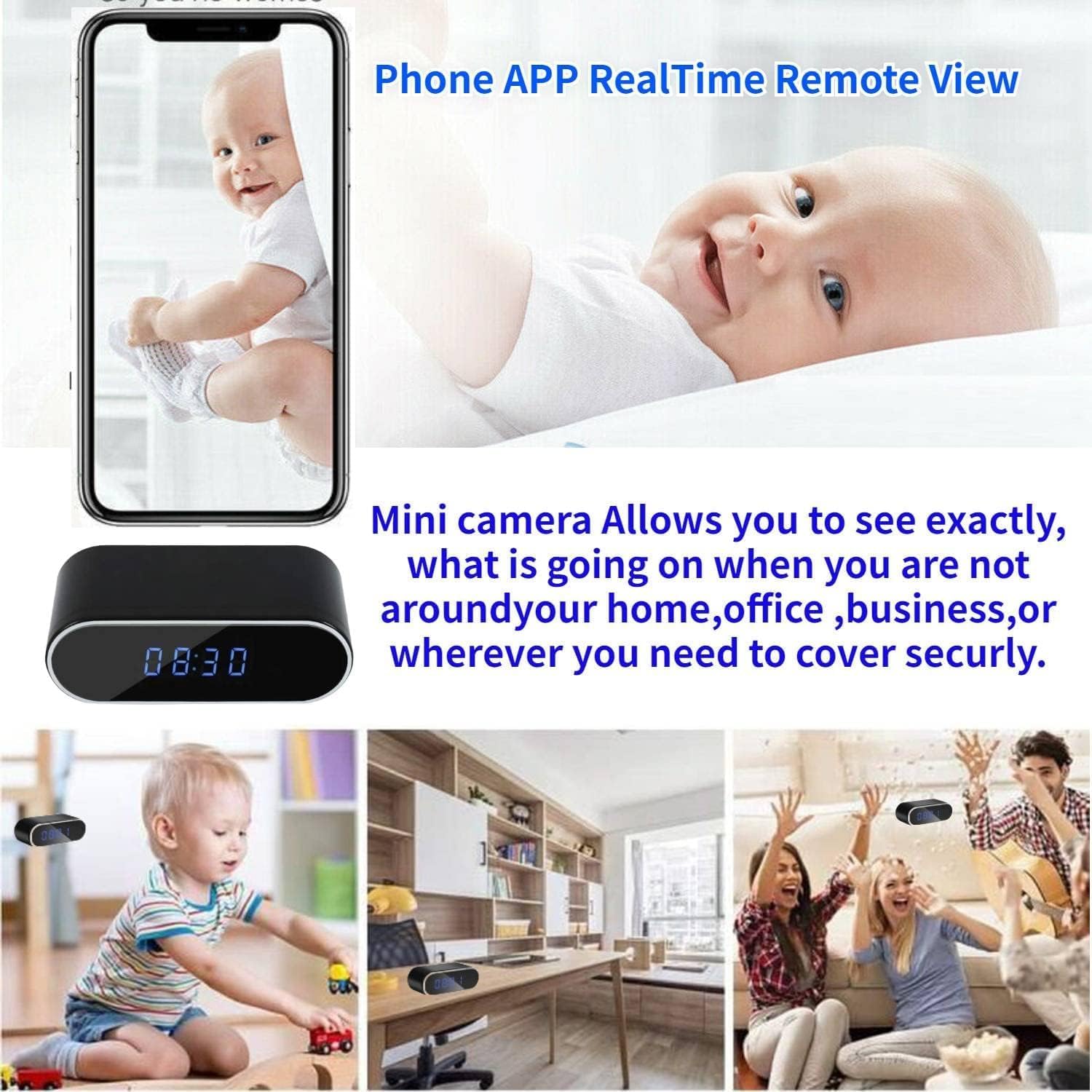 Excelente 1080P de alta resolución: cámara oculta (tarjeta no incluida) La lente de la cámara está oculta debajo de la pantalla de la lente, por lo que nadie se dará cuenta. Se puede utilizar para sala de estar, dormitorio, oficina. Supervisa a tu bebé, mensajero, cuidador de mascotas y más. Cuando la cámara de tiempo se conecta correctamente a WiFi, sincronizará automáticamente la hora