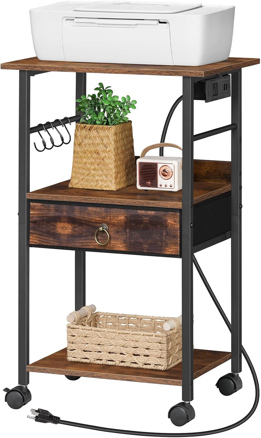 HOOBRO Printer Stand with Charging Station, Printer Table with Storage, Printer Shelf with Fabric Drawer and S Hooks, 3-Tier Printer Stand on Wheels, for Home Office, Rustic Brown and Black BF18UPS01
