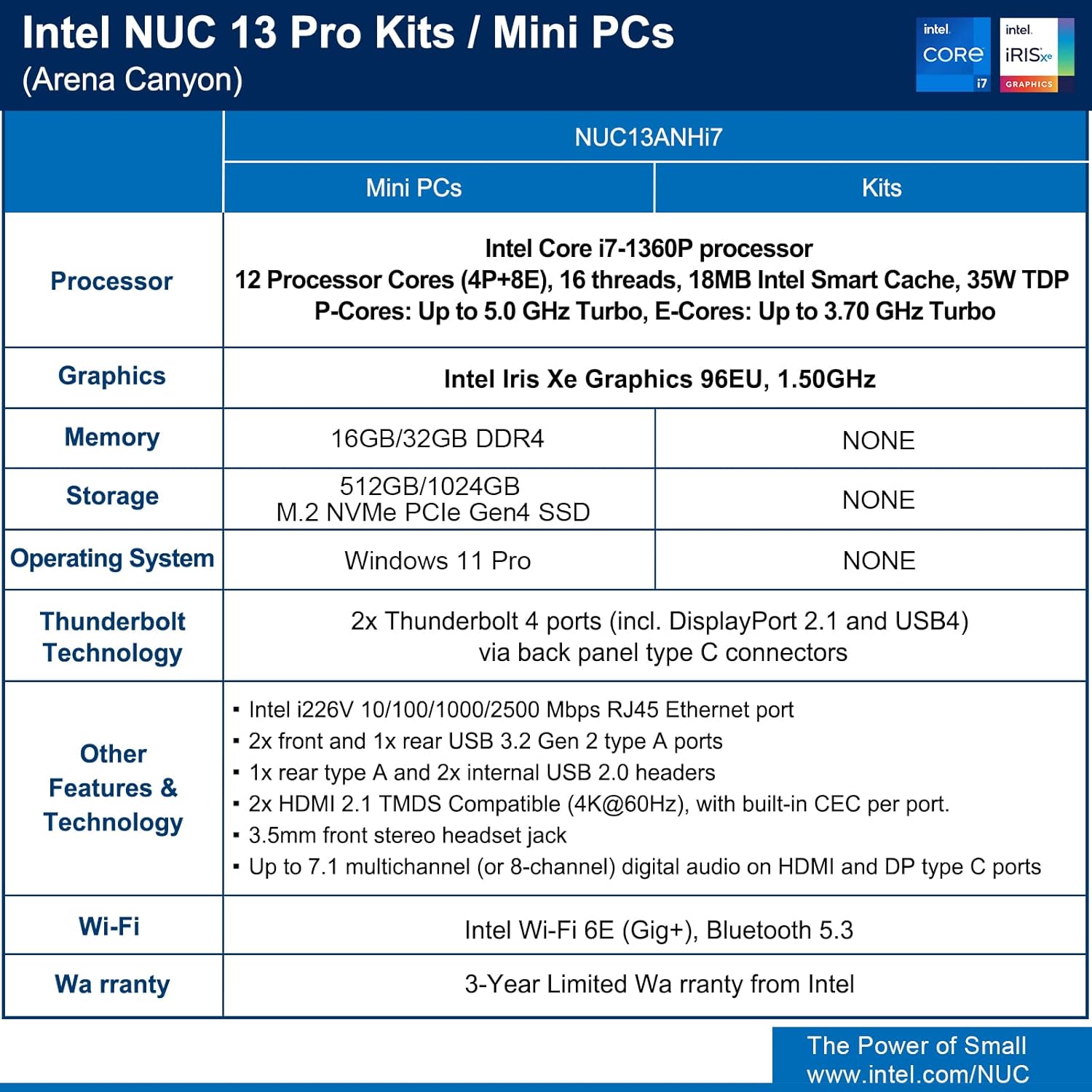 【13th Gen Intel Core i7-1360P CPU】Intel NUC 13 Pro Mini PCs, Kits, offer the perfect combination of size, performance, sustainability, and reliability to drive modern business. It all starts with 13th Gen Intel Core i7-1360P processor that deliver outsized performance in a 4×4 form factor. up to 12 cores (4P+8E), 16 threads,18MB Intel Smart Cache, P-Cores: Up to 5.00 GHz Turbo, E-Cores: Up to 3.70 GHz Turbo, Intel Iris Xe Graphics 96EU, 1.50 GHz, and up to 64GB dual-channel DDR4-3200 memory.