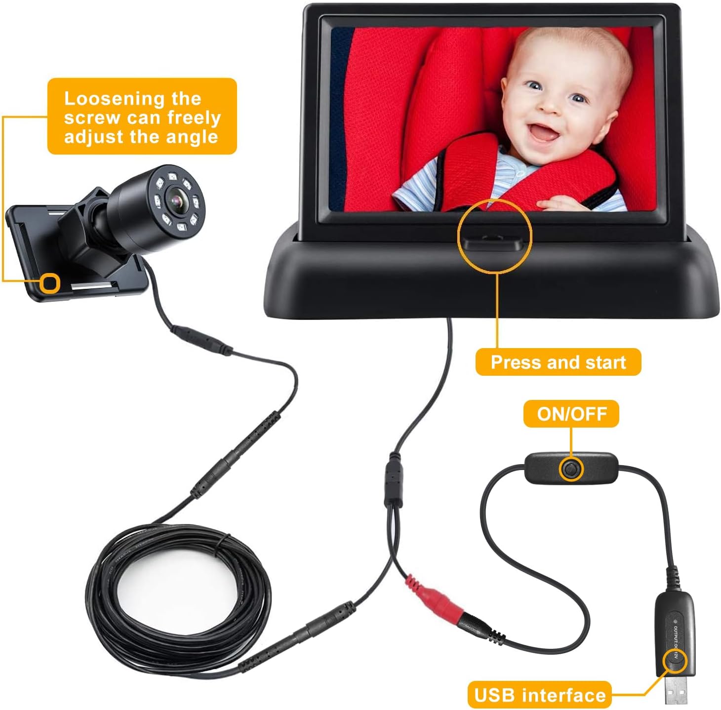 【EASY INSTALLTION】:(Upgrade USB interface)There’s no assembly required for this baby car mirror. camera simply straps to the headrest where it can be easily adjusted. Install The Monitor,As Soon as connect power supply,Then It Works.Monitor Automatically Turns On and Switch To Baby back seat.
