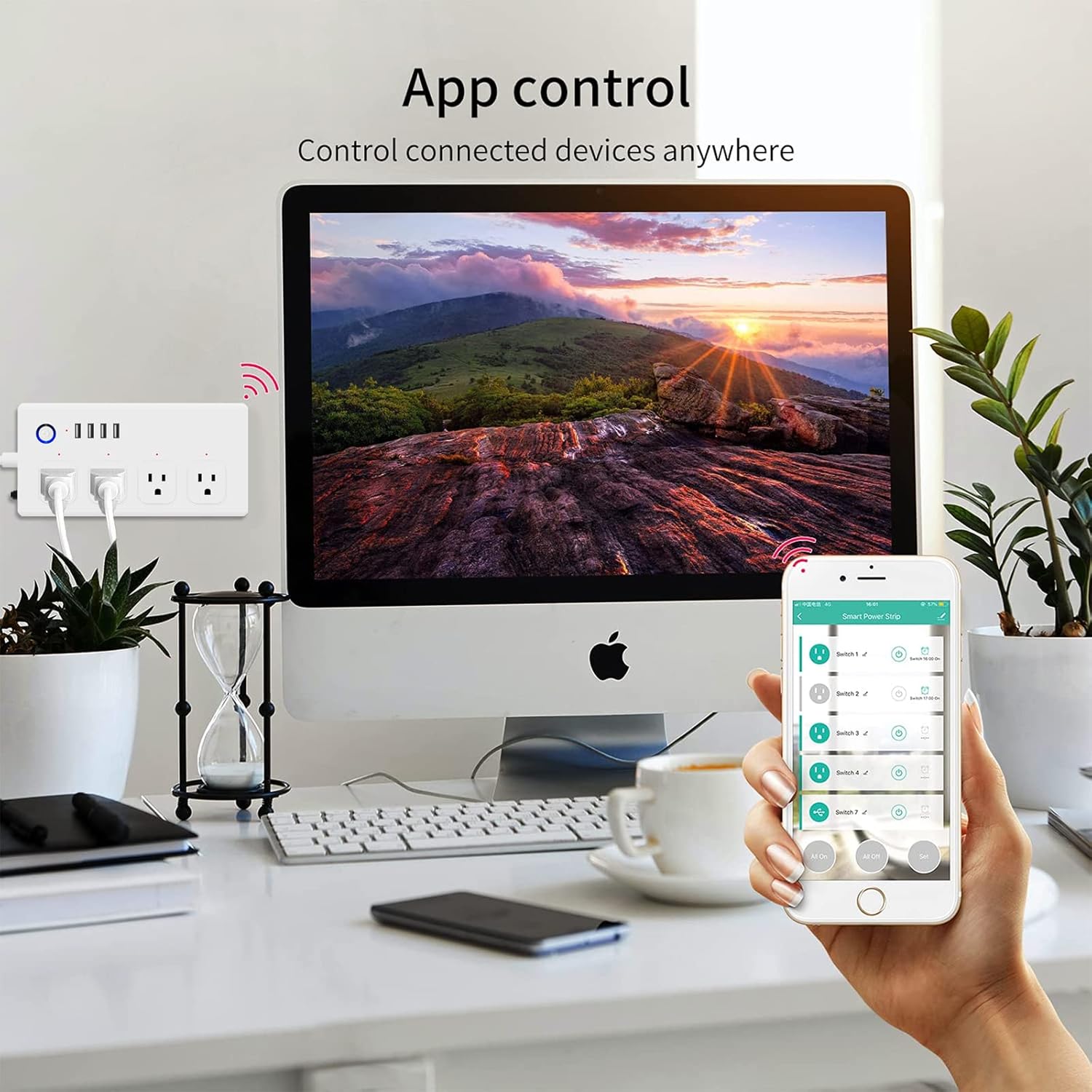⭐【Smart USB Power】The smart USB super charging port has a maximum power output of 20W, the Wi-Fi smart power strip detects your device and provides the ideal charging speed, up to 2.1A per port, eliminating any power adapter. When the current exceeds a threshold, the circuit breaker automatically opens, preventing damage to plugged-in hot equipment. A high-quality smart power strip can keep your home safe.