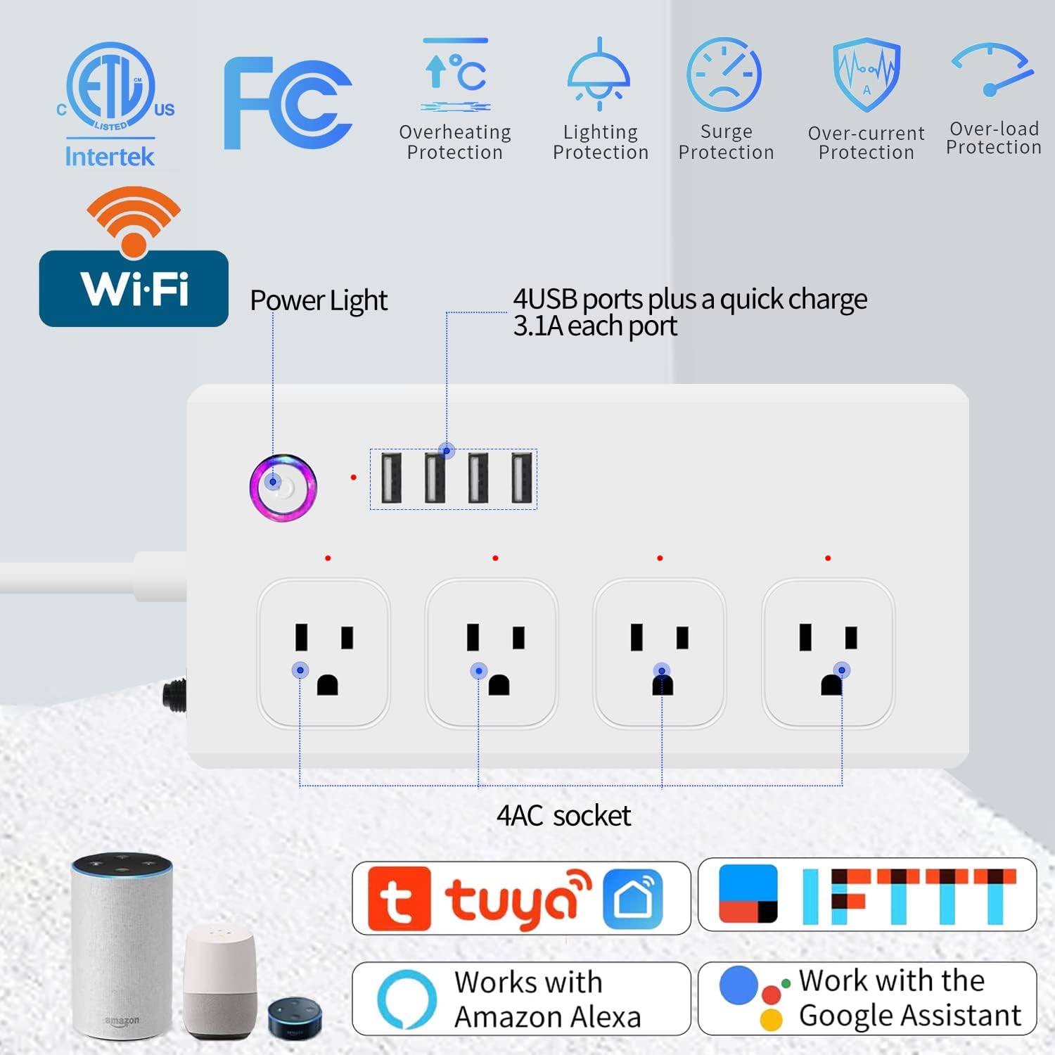 ⭐【Quality and Remote Control】Wi-Fi Smart Power Strip Surge Protector, Smart Power Strip is made of high-quality material, ETL, FCC, RoHS, and SAA certified, use full control mode or use your smartphone Control 4 sockets individually, no matter where you are. The electrical status of the Wi-Fi Smart Power Strip Surge Protector is fed back to your phone in real-time.