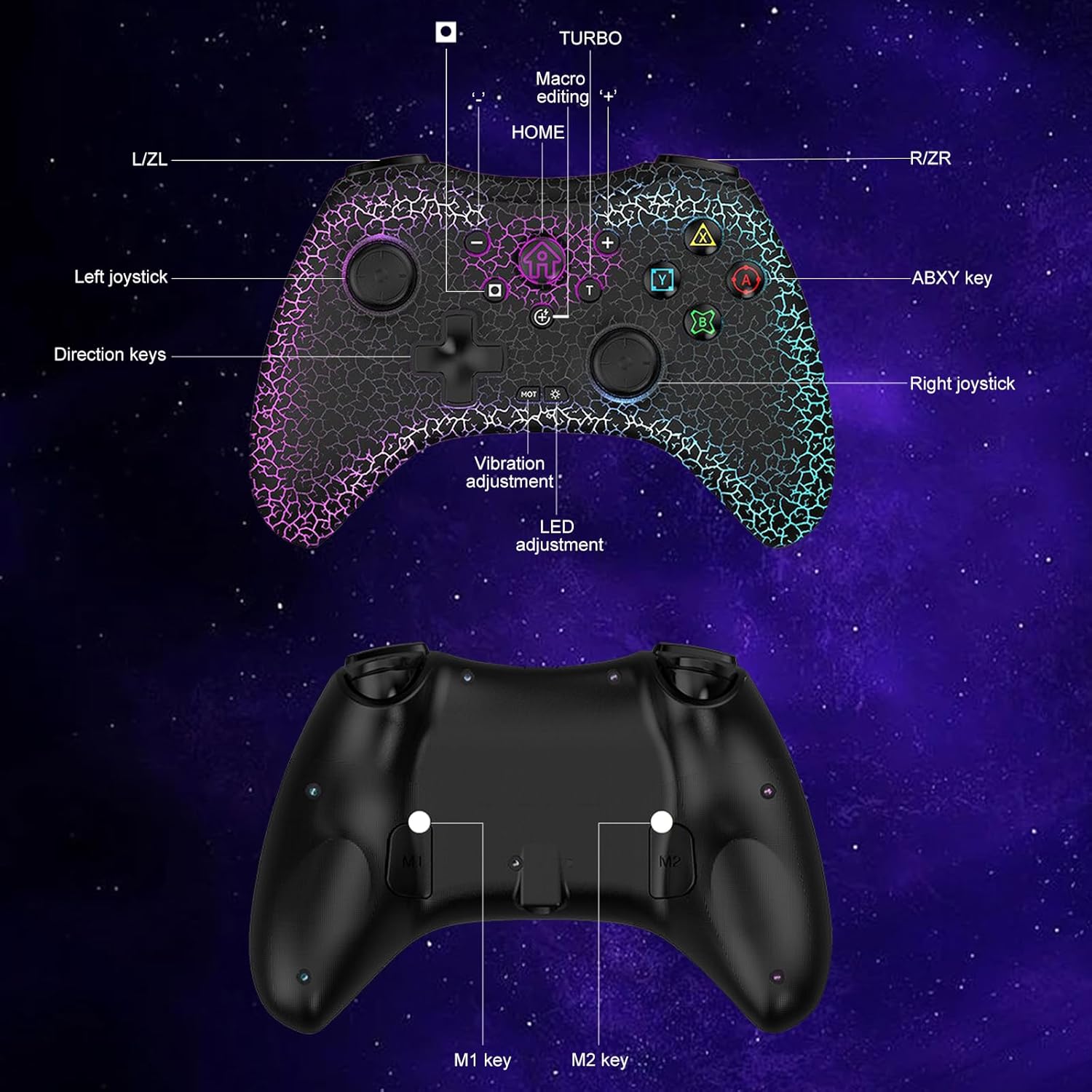 🎮【Macro Programming Function】: The gaming controller has 2 back programming buttons with single or multiple programming modes, M1/M2=A+B+Y+X+L+ZL+R+ZR+L3+R3+D-pad, custom programming keys to help improve the gaming experience and extend the life of the controller buttons.