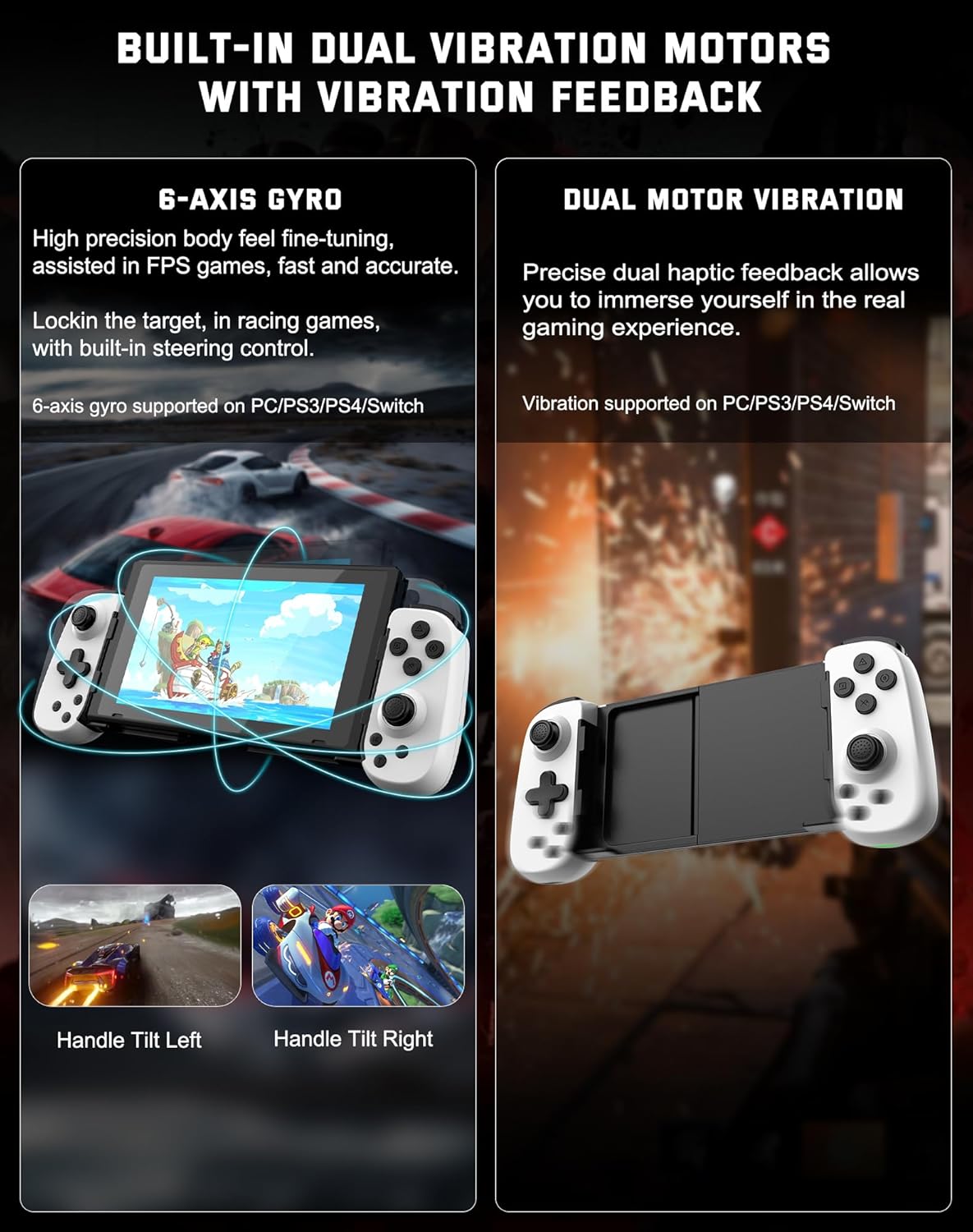 🎮 ✅ 【IMMERSIVE GAMING FEATURES】: The wireless switch controller comes with dual haptic feedback and a 6-axis gyro that provide you excellent vibration feedback and accurately tracks the movement of your handle to enhance the game immersion. [Vibration and 6-axis gyro supported on PC/PS3/PS4/Switch only]