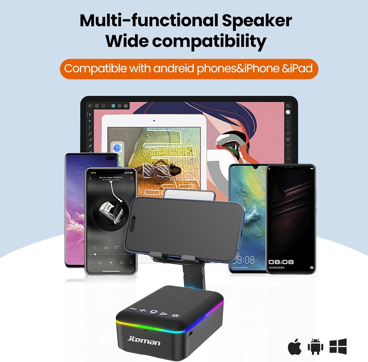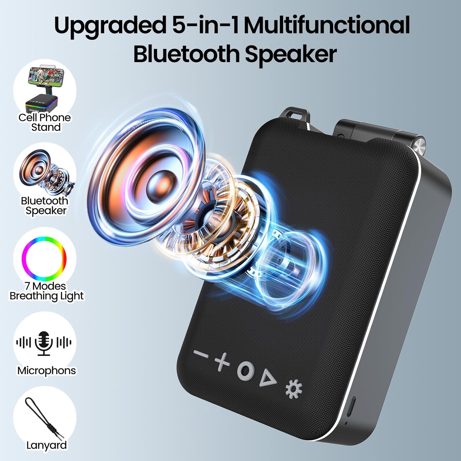 Newly upgraded multifunctional gadget: JTEMAN multifunctional device combines a portable Bluetooth speaker, cell phone stand, LED light, lanyard and built-in microphone. Whether you’re indoors or outdoors, the detachable lanyard ensures it’s easy to carry and perfect for all your adventures. It also brings great convenience for watching videos and making hands-free calls, Ideal birthday gift for women men!