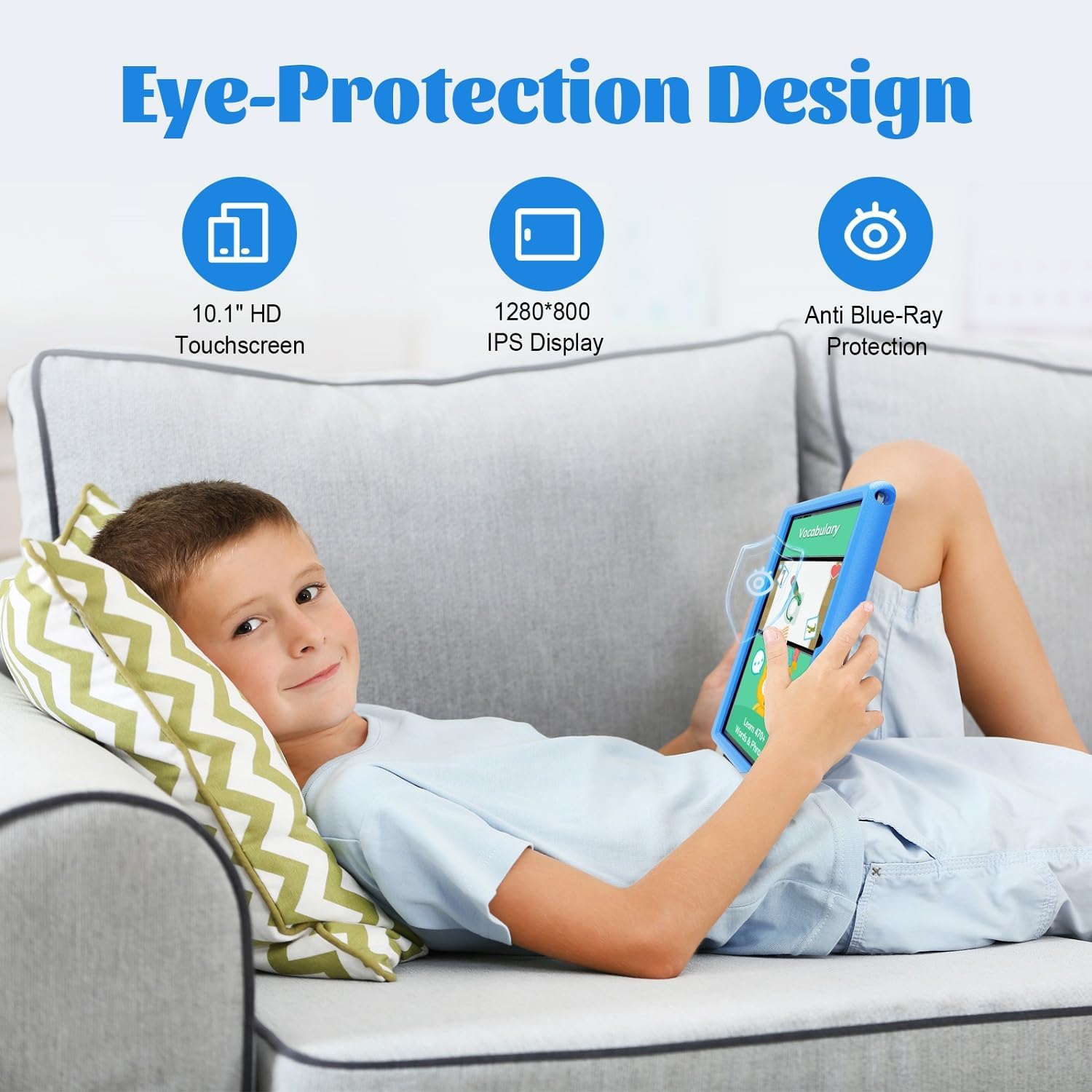 【Quad Core Android 12 System】The 10 inch kids tablet equipped with Quad-core processor, Android 12 Go operating system, 10.1 inch 800×1280 IPS HD display, 2GB RAM and 32GB ROM. It is designed for kids to provide a safe environment to learning and entertainment.