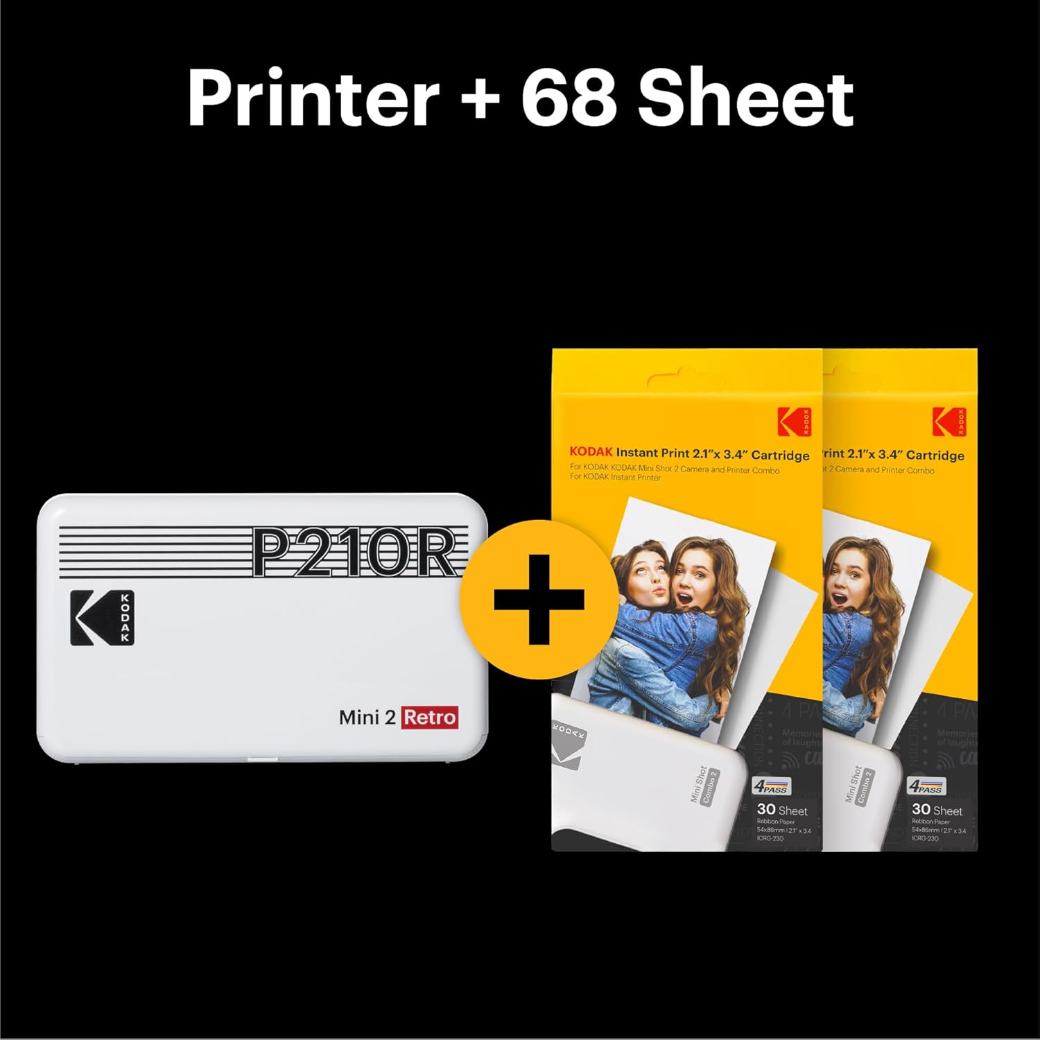 KODAK Mini 2 Retro 4PASS Portable Photo Printer (2.1×3.4 inches) Initial 8 Sheets + 60 Sheets Bundle, Black