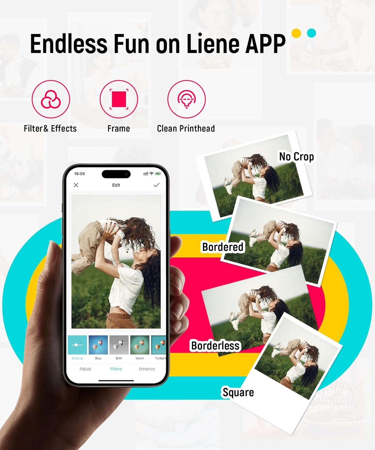 [New App function – Clean print head] Don’t know what to do when there are white spots, white lines or other dirt on the photo when printing? The Liene team has added a new feature (clean print head) to the photo app, which greatly solves the problem and gives you better photo quality. Note: A blue calibration card is required when cleaning the print head. See the videos on the product page for details. Note: Photos can only be printed through the Liene app.
