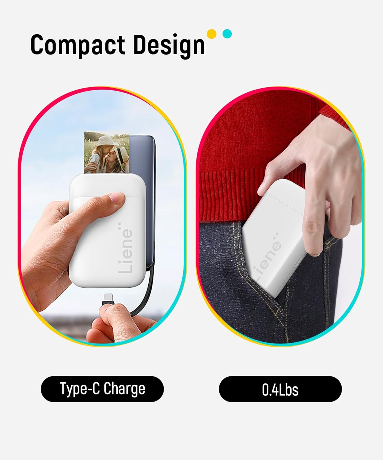 [Print Mono Photo Paper & Wireless Printing] Liene can print color and mono photos (you could buy extra mono papers), which is committed to transmitting more happiness and joy through photo sharing and has launched this phone printer. The lighter weight allows you to carry the picture printer for iphone in your bag to the party, which will not take up too much space or burden you. The photo printer for iphone w/ type-C charging port. 30 sheets of photo printings are available at one charge.