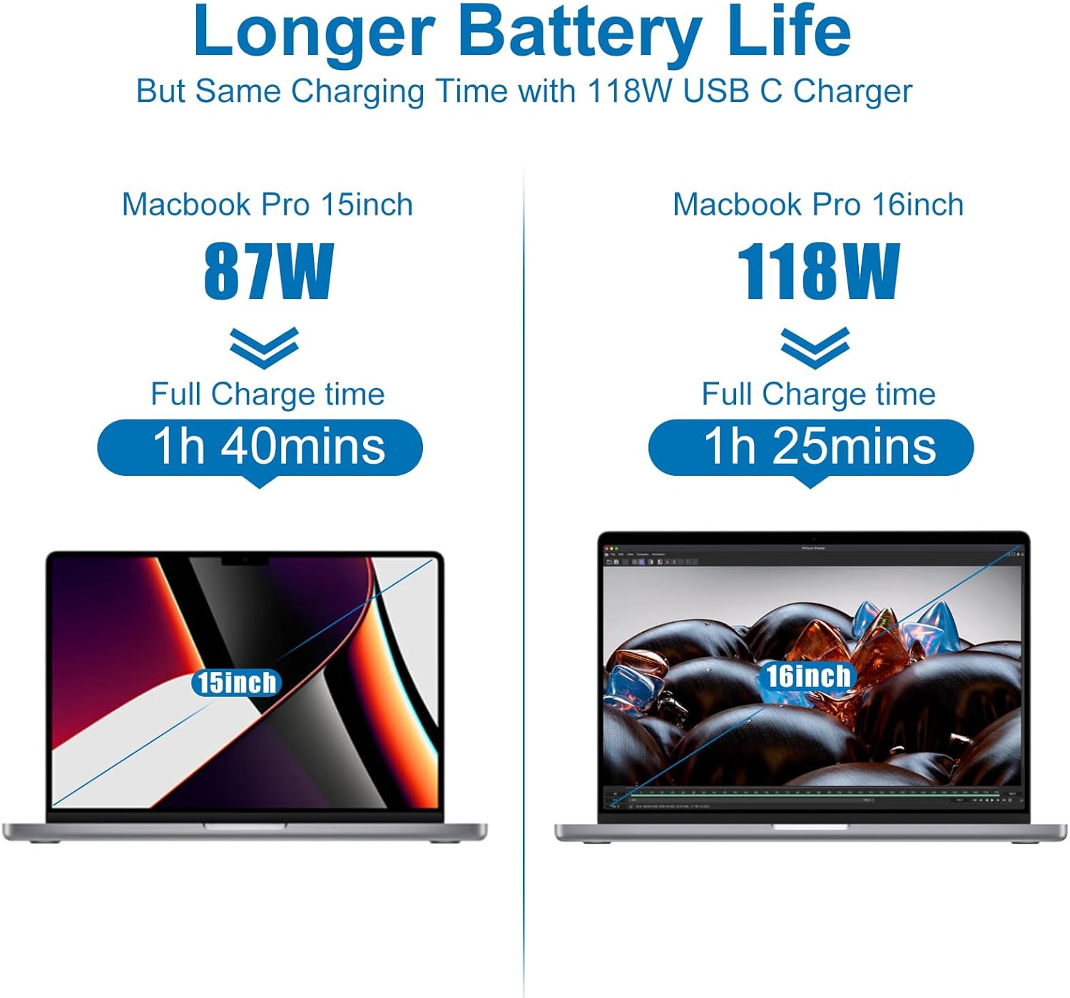 【EXTRA LONG USB C TO USB C CABLE AND COMPACT SIZE】: Our 118W macbook charger is 5% smaller than the original usb c charger power adapter but the charging efficiency is higher than the original macbook pro charger. An extra long 10ft usb c to usb c cable is included! The size of the macbook air charger is 3.2*1.2*3.2 inch. Weighs only 7.4 ounces.