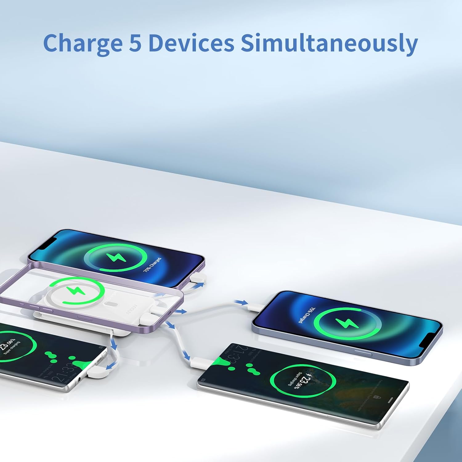 🔋 22.5W Fast Charging&Bulit in Cables:Our power bank up to 22.5W fast charging,this portable phone charger with with 5 outputs,Wireless magnetic charge,built in type-c&other output charging cables and additional USB C and USB A outputs port,It supports 5 devices charging max simultaneously and type-C&other port Fast recharging