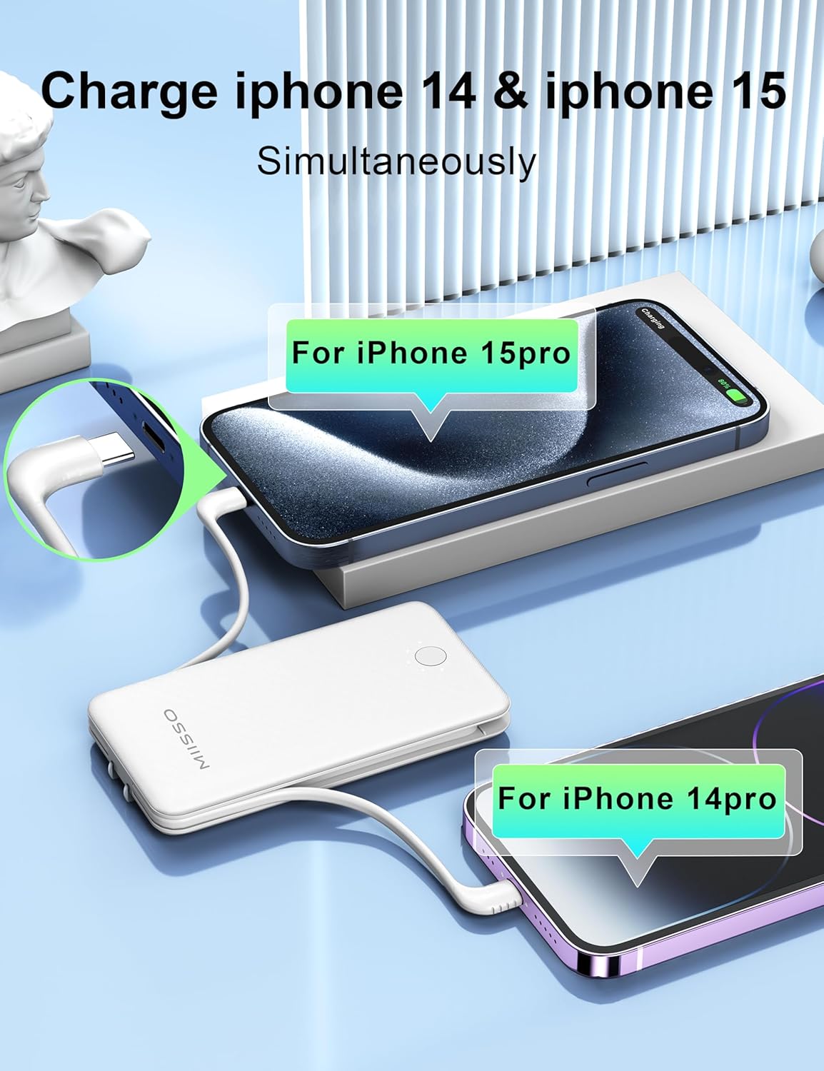 Power Bank with Cable: Not only has USB C cable, but also has IP cable, miisso power bank is compatible with iPhone, Android devices, and USB-C mobile phones and smart devices etc. You do not need to take charging cables.