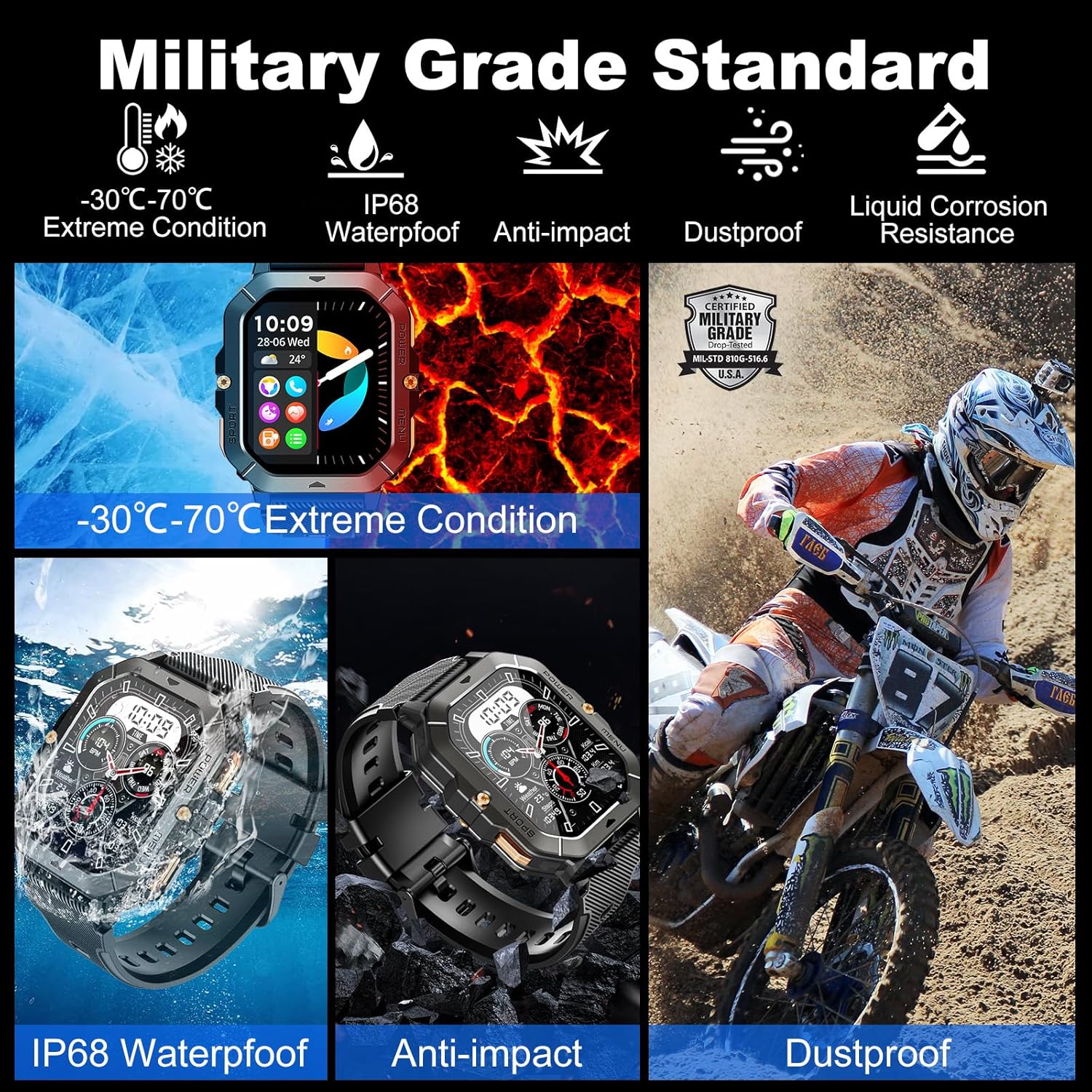 【5ATM Waterproof Military Smart Watch】The military smart watch for men is made of solid meterail zinc alloy,and the smartwatch is anti-impact,shockproof and dustproof for professional outdoor sports and adventures. Especially, it can keep mormal function even in very low -30℃ and high 70℃ temperatures.This men’s smartwatch is IP68 waterproof.You can wear it to the deepth of water up to 50m,and the smartwatch still keep your data accurate.
