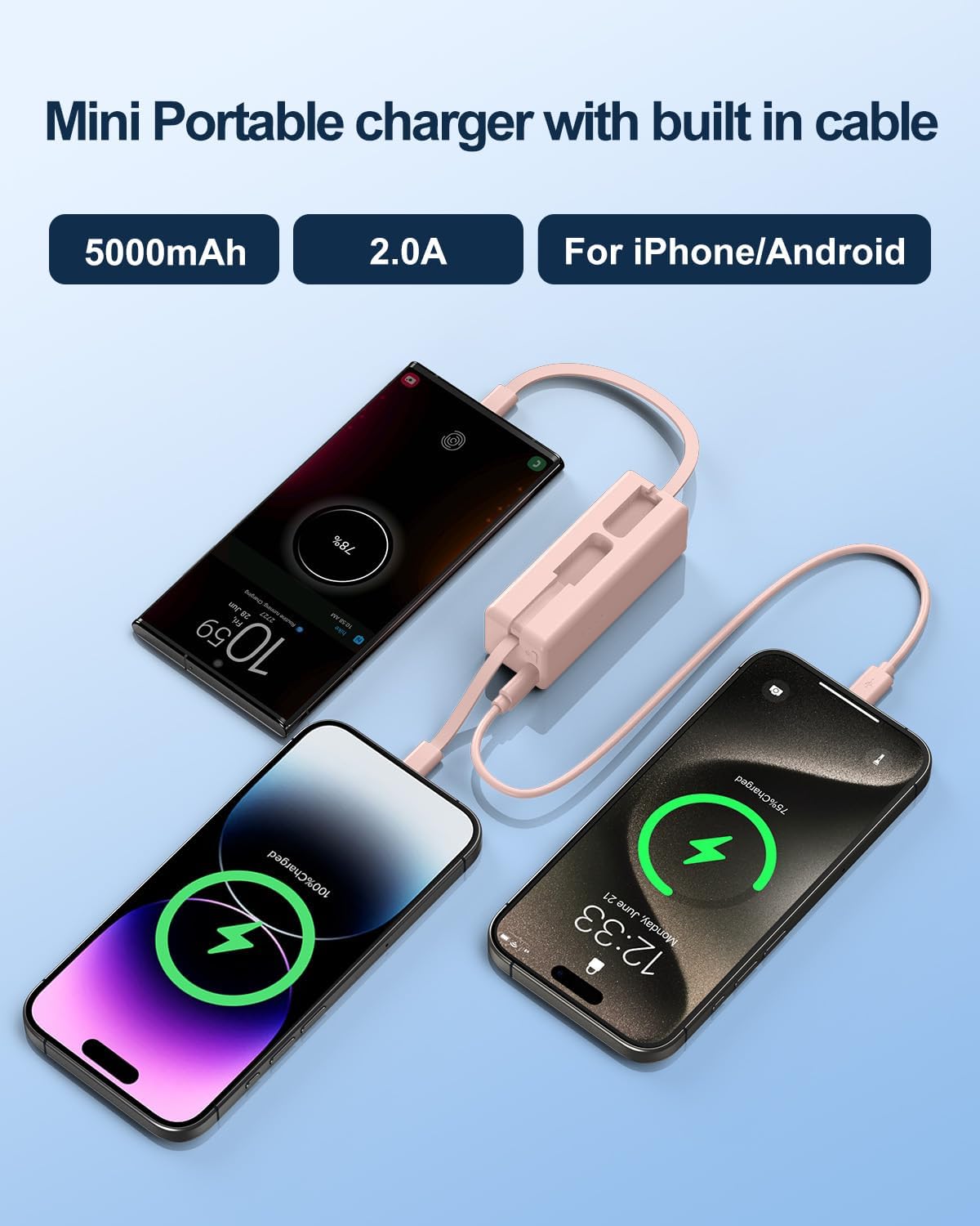 Mini Portable Charger Small Power Bank 5000mAh Battery Pack with Built-in USB C and LT Cables Ultra Compact Portable Charger for iPhone 15 14 13 12 11 Pro Max Samsung Galaxy Android and More (Pink)