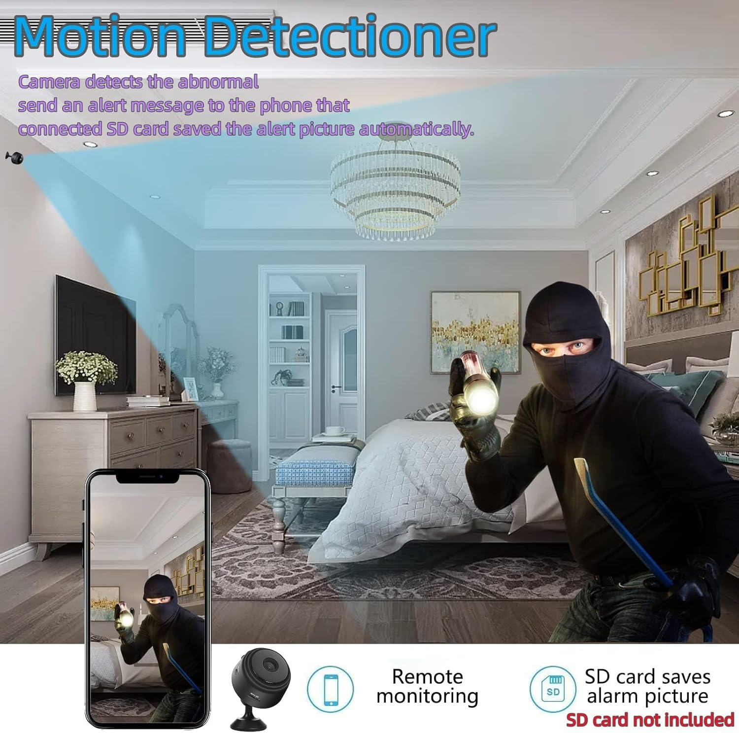 2. Motion Sensor This mini wifi camera features a night vision and motion sensor that delivers 1080P images in dark environments and a large viewing angle for more detail.